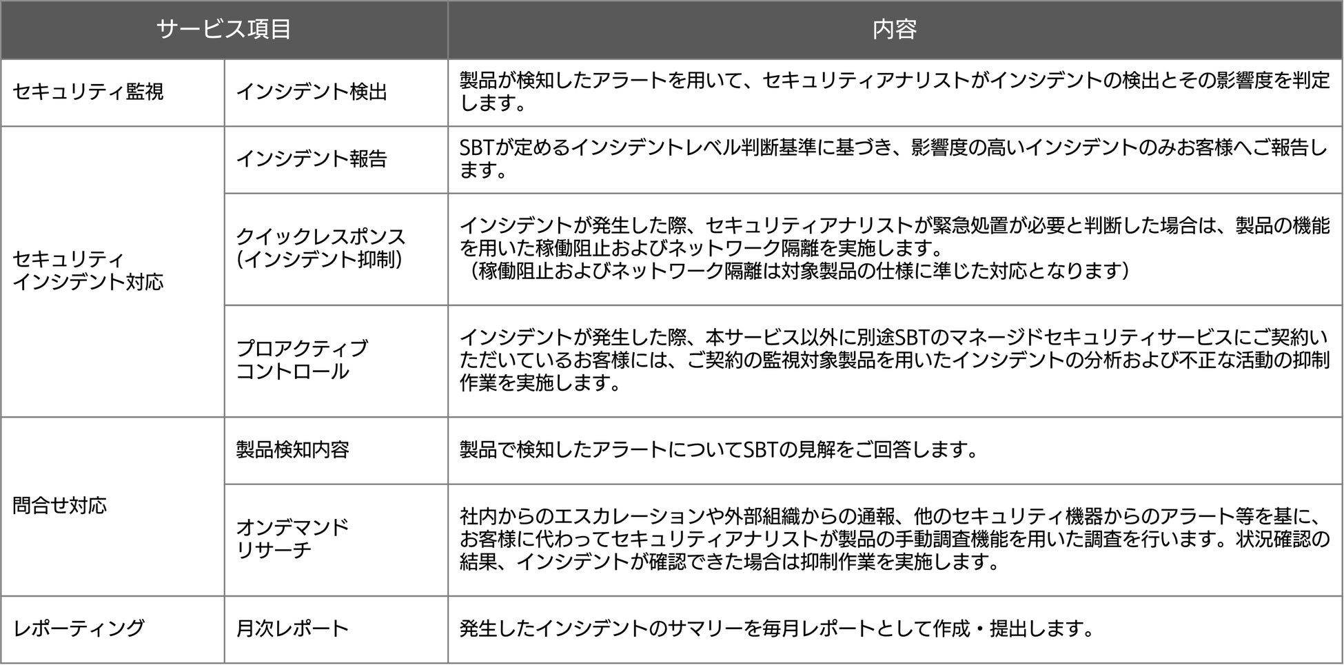 インシデントが発生した際、本サービス以外に別途SBTのマネージドセキュリティサービスにご契約いただいているお客様には、ご契約の監視対象製品を用いたインシデントの分析および不正な活動の抑制作業を実施します。