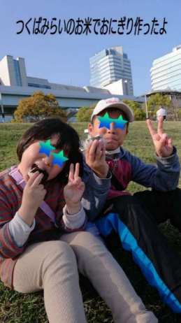 支援品のつくばみらい市産のお米を持って喜ぶ子供たち