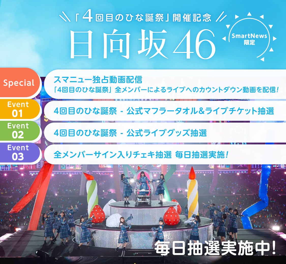 SmartNews、日向坂46のデビュー4周年を記念し特別企画をスタート。デビュー記念ライブ「日向坂46 4回目のひな誕祭」のチケットや、メンバー32名のライブカウントダウン動画を17日連続で公開!