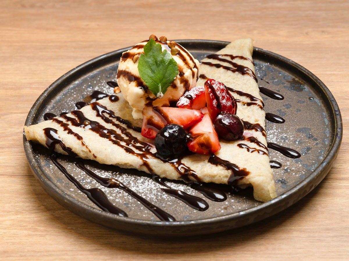 そば粉を使ったオリジナルのガレット生地にあまりんとチョコレートソース、バニラアイスを合わせたスイーツです。