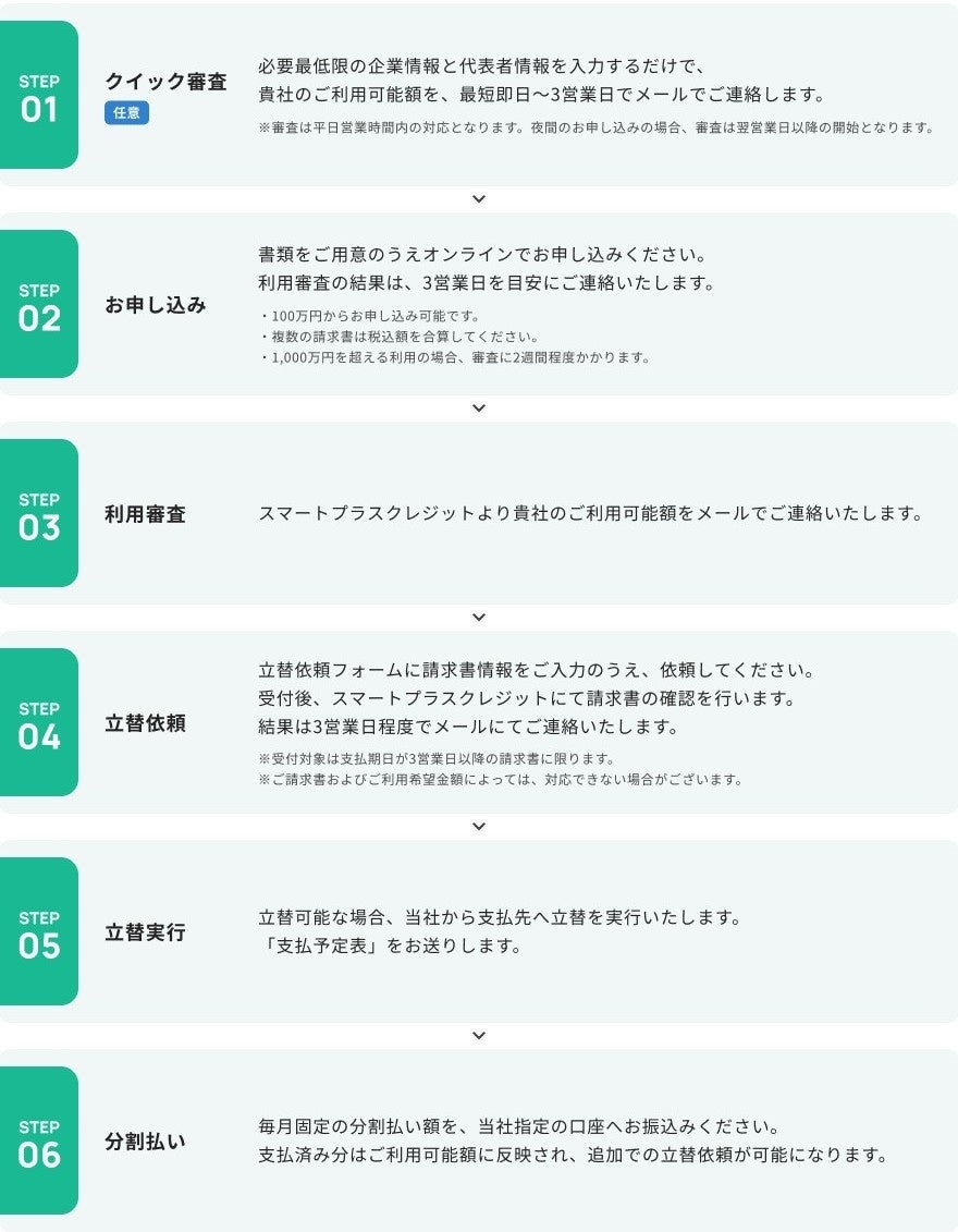 「BizGrowth」は、スマートプラスクレジットがお客様企業に代わり取引先に立替払いをすることで、請求書支払いを分割あと払いにできるサービスです。オンラインで完結する申し込みとスピーディーな審査が特長です。