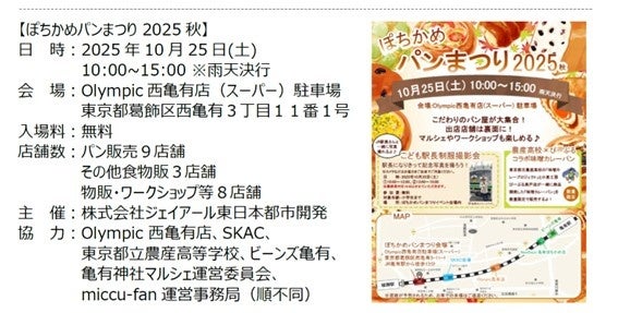 JR常磐線 亀有駅~綾瀬駅間の高架下施設「ぽちかめ」では、2025年10月25日(土)に、今年3月に開催して大変ご好評いただきましたイベント「パンまつり」を更にパワーアップさせた「ぽちかめパンまつり 2025秋」を開催いたします。
