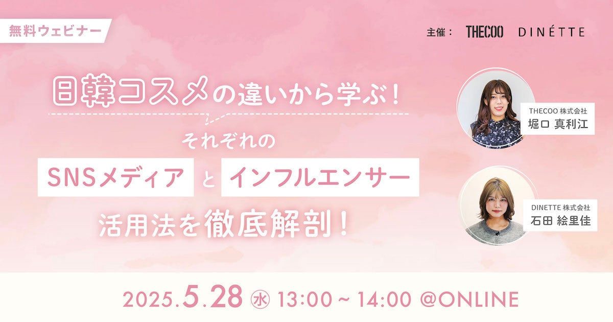 インフルエンサーマーケティング事業を展開するTHECOO株式会社(本社:東京都渋谷区、代表取締役CEO:平良真人、以下「THECOO」)は、DINETTE株式会社(本社:東京都渋谷区、代表取締役:尾﨑美紀、以下「DINETTE」)とともに、無料ウェビナー「日韓コスメの違いから学ぶ!それぞれの"SNSメディアとインフルエンサー"活用法を徹底解剖!」を、5月28日13時より開催いたします。