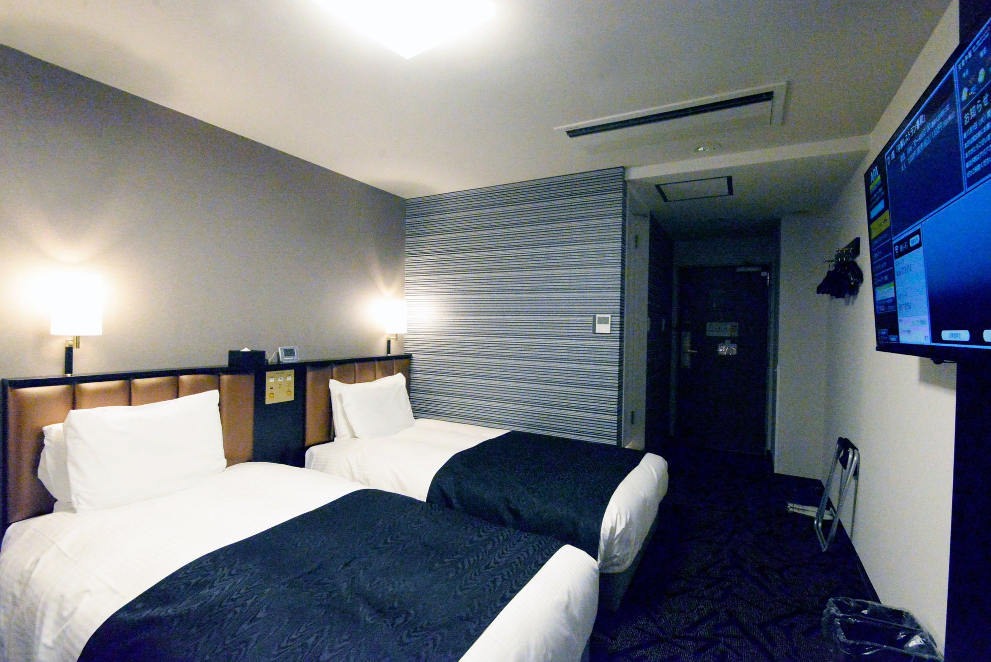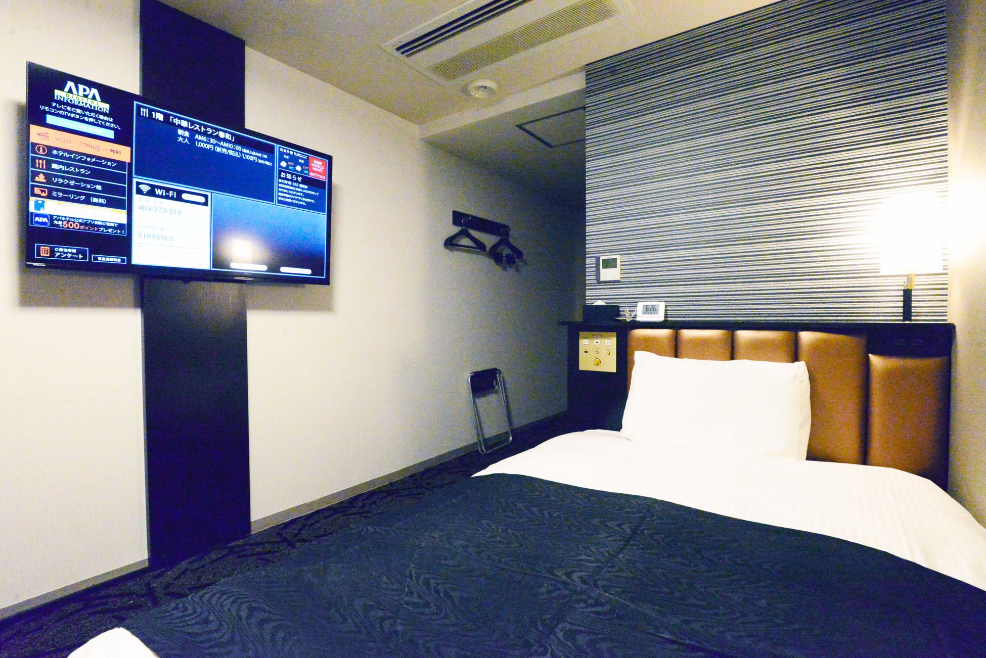 | 客室標準仕様 | ① 50型以上大型液晶テレビ ② 照明スイッチ類、コンセント、USBポート、HDMI端子を集約した枕元集中コントローラー ③ ホテルの館内案内をテレビ画面に集約表示したアパデジタルインフォメーション ④ スマートフォンの画面をテレビに映すことができるミラーリング機能 ⑤ VODアパルームシアター200タイトル以上を無料で見放題 ⑥ BBCワールドニュース 無料放映 ⑦ 通信速度とセキュリティの面で優れたWi-Fi無料接続(有線LANとの同時接続可能) ⑧ サータ社製ベッド ※一部アパホテルオリジナルベッド「Cloudfit Grand(クラウドフィットグラン)」導入 ⑨ ふんわりやわらか高級羽毛布団(デュベ) ⑩ 仕様の異なる2種類のオリジナル枕(「Pride Fit(プライドフィット)」、「Adjust Fit(アジャスト フィット)」) ⑪ 客室の明るさにこだわったLEDシーリングライト ⑫ バイオマス原料や再生プラスチックを用いた環境へ配慮した客室アメニティ(歯ブラシ・ひげ剃り・ヘアブラシ・シャワーキャップ) ⑬ ユニバーサルデザインの一環として、客室内の案内ステッカーを視覚的にわかりやすいピクトグラムを用いたデザインへ刷新 |