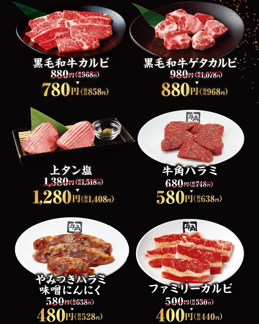 まろやかな脂でとろけるような口どけの「黒毛和牛カルビ」、噛むたびに広がる濃厚な肉汁がたまらない「黒毛和牛ゲタカルビ」もお得にご提供。さらに、牛タンならではの旨みを嚙みしめる厚切りジューシーな「上タン塩」も割引価格でお楽しみいただける贅沢なチャンスを、この機会にぜひ。