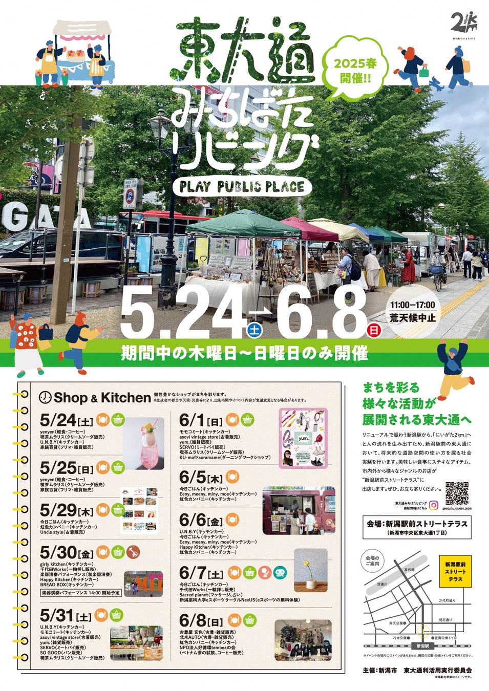 新潟駅前の東大通で人中心の空間づくり社会実験を実施!「PLAY PUBLIC PLACE 東大通みちばたリビング2025春」5/24(土)スタート!