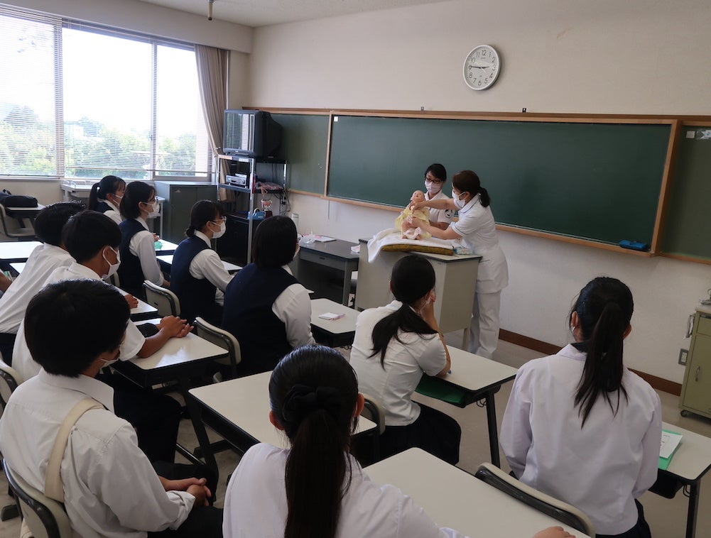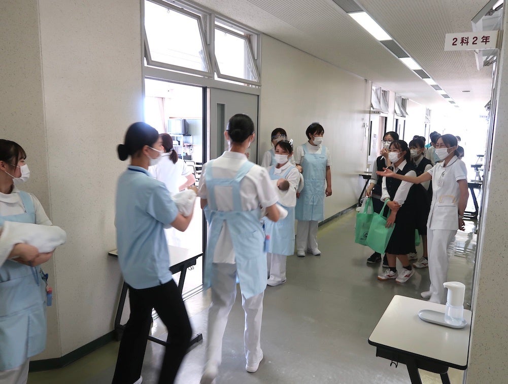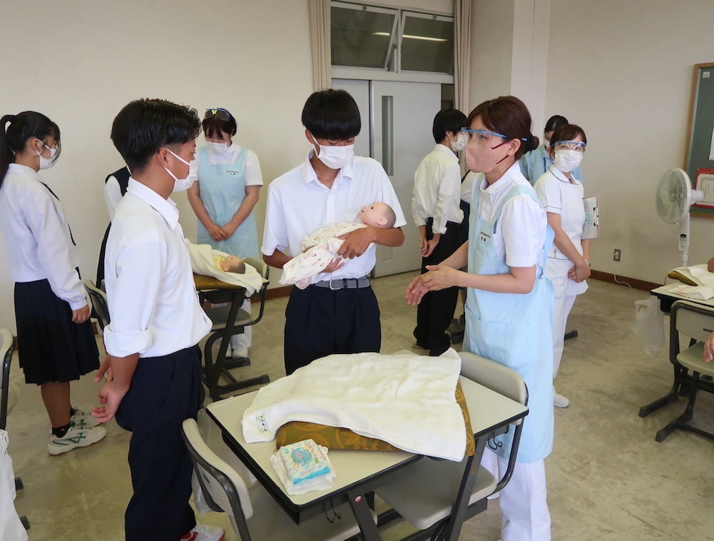 模擬授業「母性看護学」で赤ちゃんの抱き方やおむつ替えを学ぶ