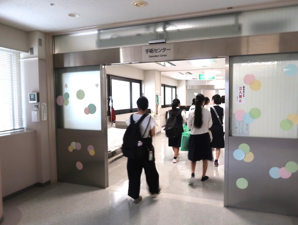 次は看護学校と市民病院をつなぐ渡り廊下を通り、いざ市民病院の見学へ!看護学校のカリキュラムの中には、かならず病院での実習が組み込まれています。