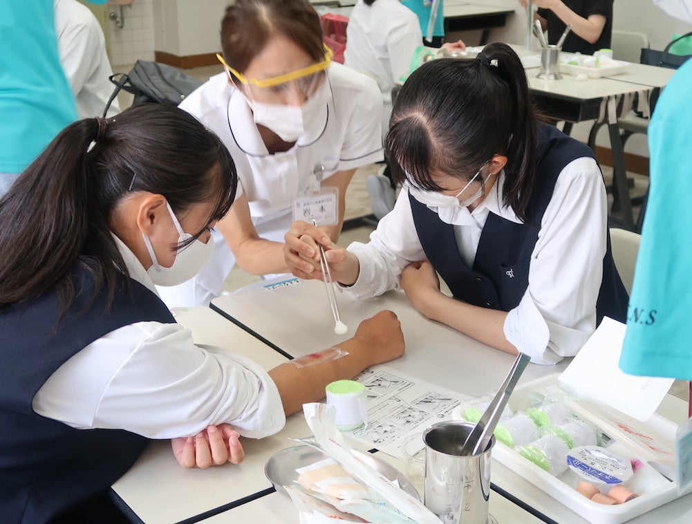 包帯などを使って実際に創傷処置を体験