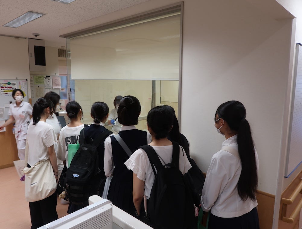 そして最後には、救急車が留まっている外のエリアを見ながら救急搬送口を通り、救急外来の様子を見学。病院を見学していると、どこへ行っても看護師さんやスタッフの方が温かく迎えてくれ、明るく挨拶してくれたり、「〇年前の卒業生だよ」と声をかけてくれることも。