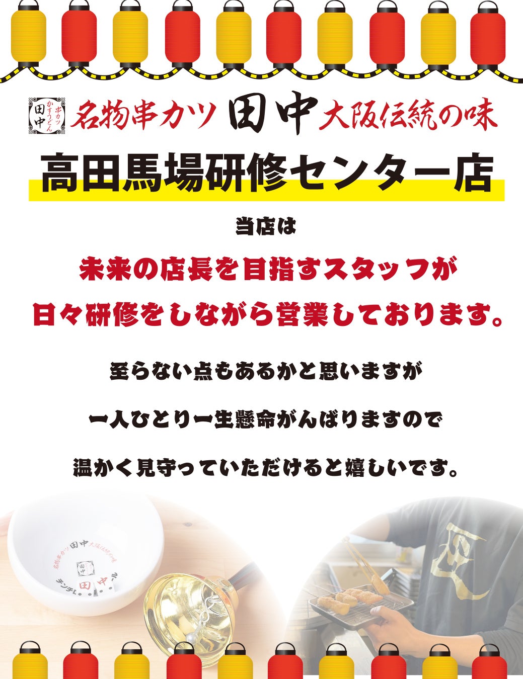 研修センター店として選ばれたのは、売上規模が高く、席数も多く、都心で様々なお客様が来店される「串カツ田中 高田馬場一丁目店」です。店名を「高田馬場研修センター店」へと変更し、研修専門拠点とすることで、中途・新卒ともに入社時から質の高い、豊富な実務経験を積むことが可能となります。また、会社の理念を体現する“研修センター長”が指導にあたり、入社後30日間でオペレーションだけでなく、串カツ田中の理念である「お客様の笑顔を生む」営業を体現できるプロフェッショナルなスタッフの育成を目指してまいります。