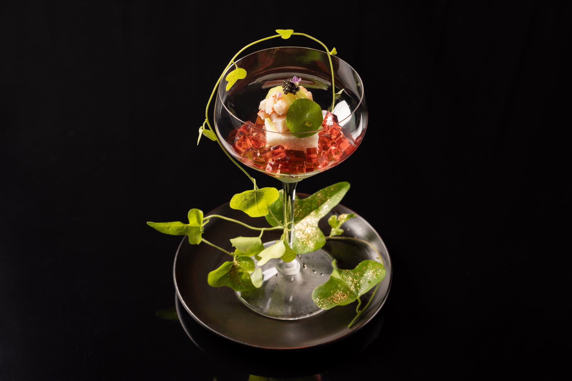 寒天を使った信州の郷土料理「天寄せ」に、冷涼な気候で育ったルバーブを使用。「棚田ラウンジ」の夕暮れの情景を表現した先付です。ルバーブの爽やかな酸味がじっくりと蒸したワタリガニの濃厚な味わいを引き立て、金時草やスナップエンドウの食感が楽しい一品です。