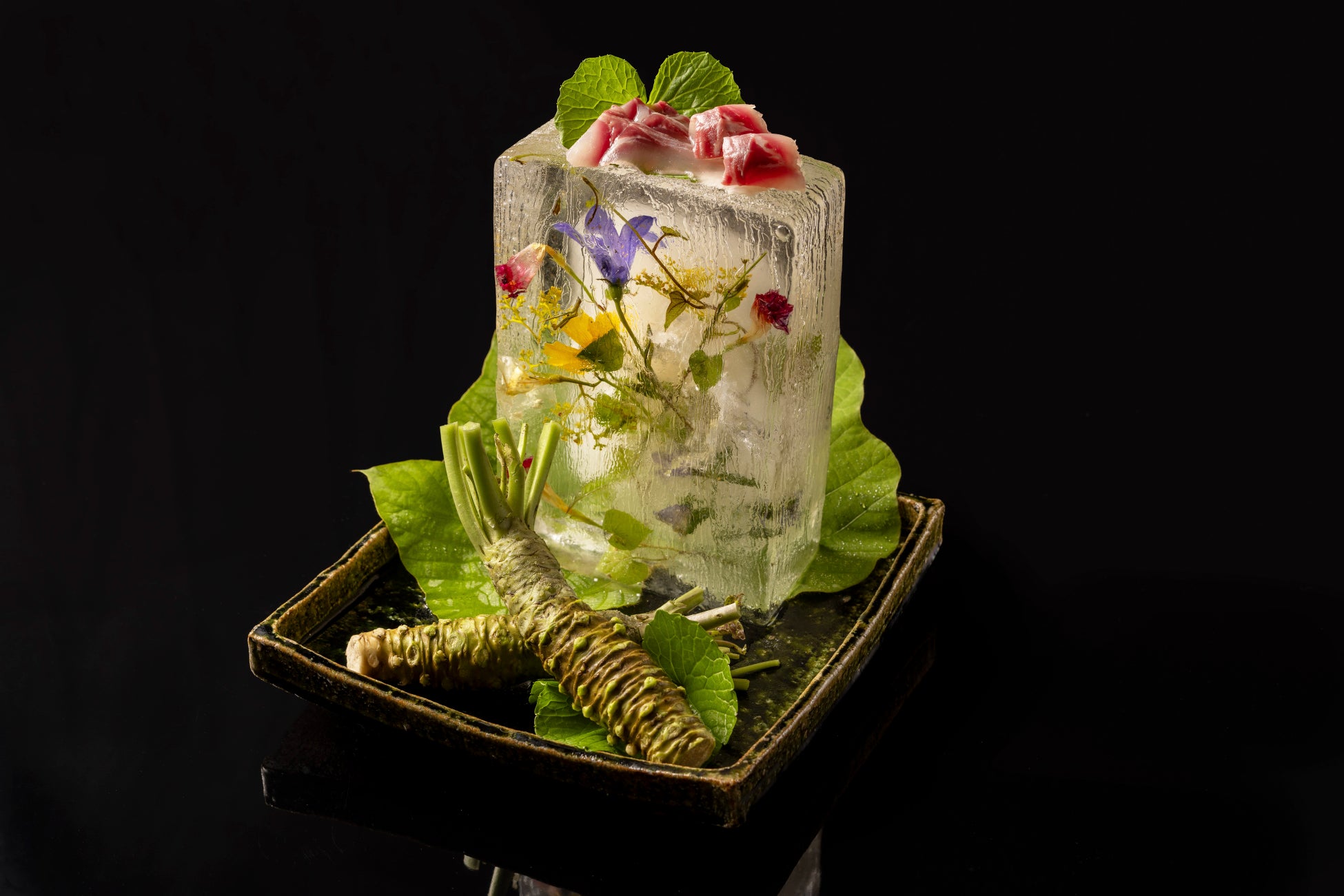 清流で恵まれた信州・佐久では臭みが少ない鯉の養殖が盛んです。今回の献立では、鯉の食感を活かした薄造りを夏に咲く草花を氷に閉じ込めた花氷の上に飾り、目でも舌でも涼やかな夏山の美味を味わえます。