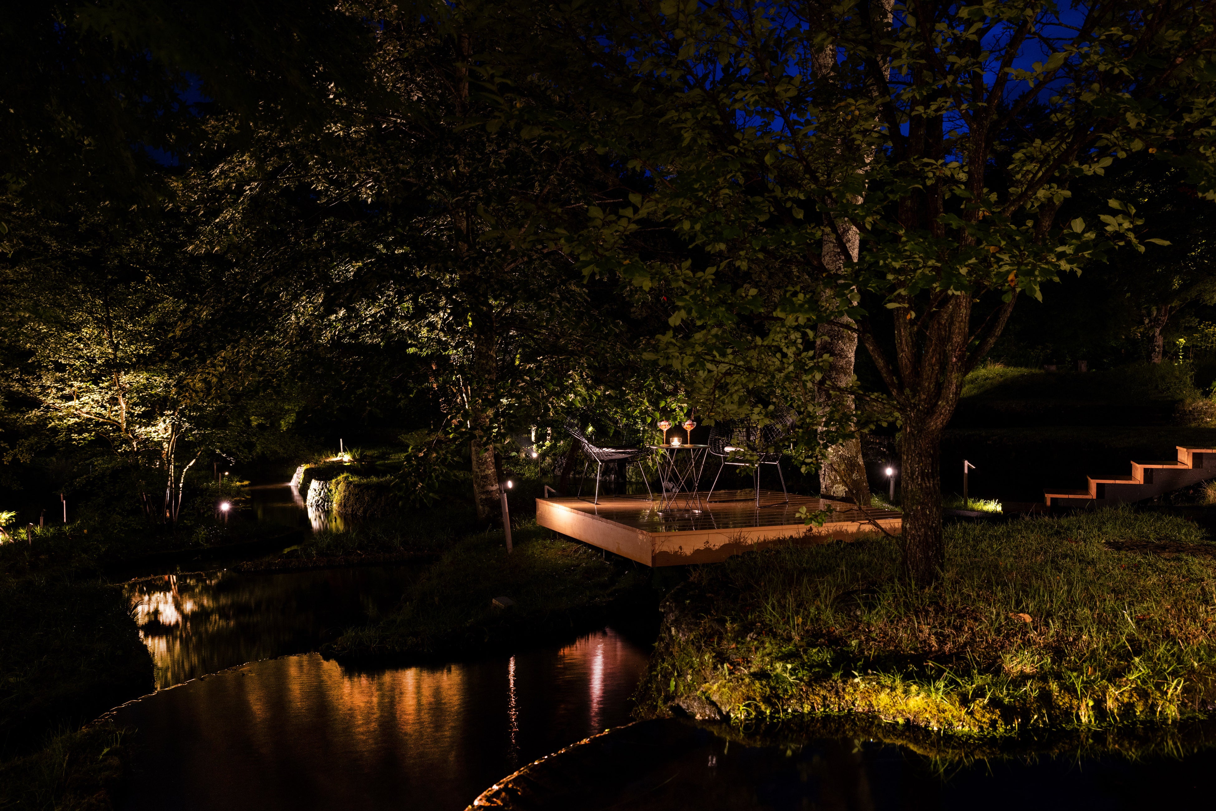 ⾕の集落に滞在する。離れの客室は⽔辺を囲み、部屋のテラスからは季節のうつろいが感じられます。「軽井沢野⿃の森」に⾯した豊かな⾃然環境にて、休息の時間を満喫できる滞在型の宿泊施設です。