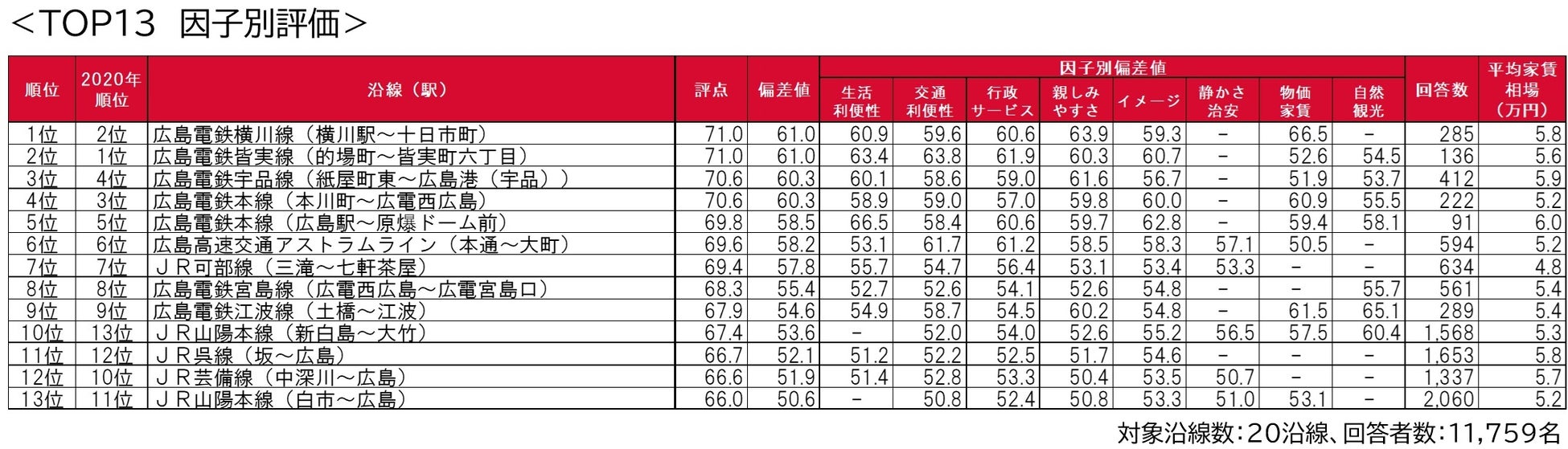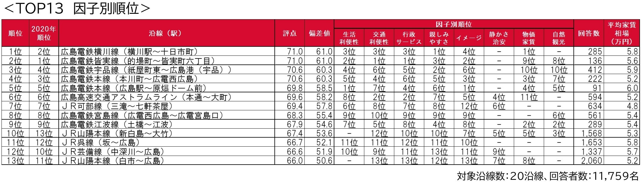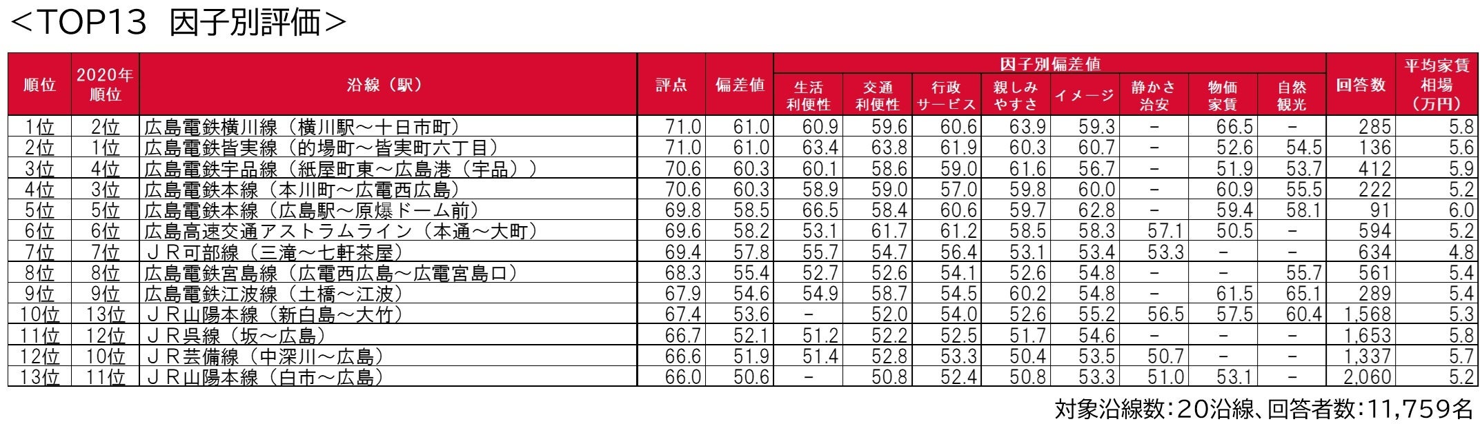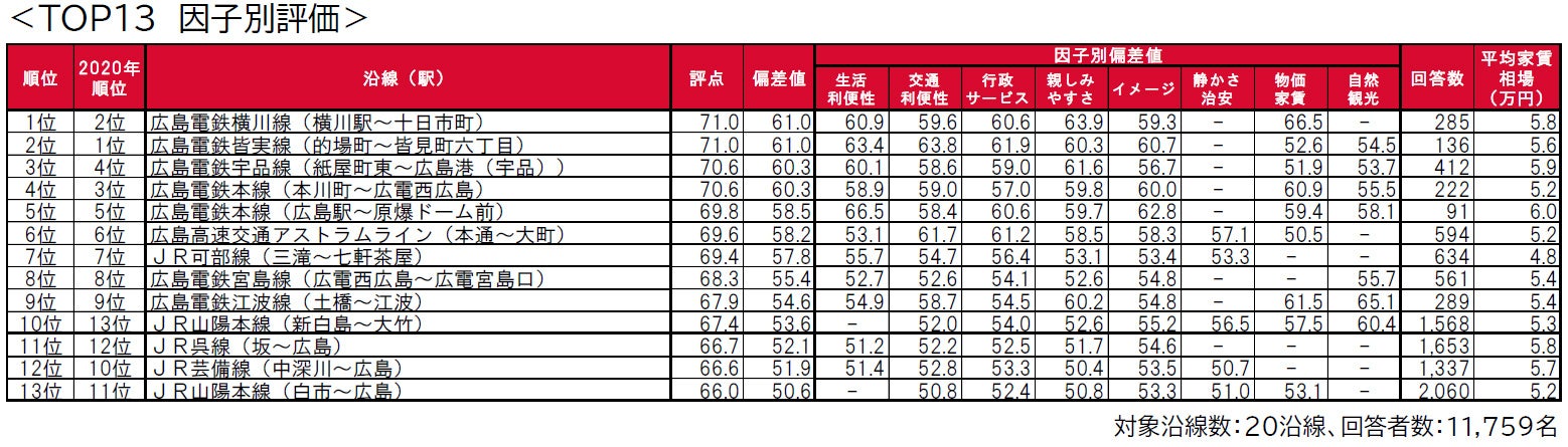 - 街の住みここち沿線ランキング2021<広島県版> <TOP13の因子別評価>
