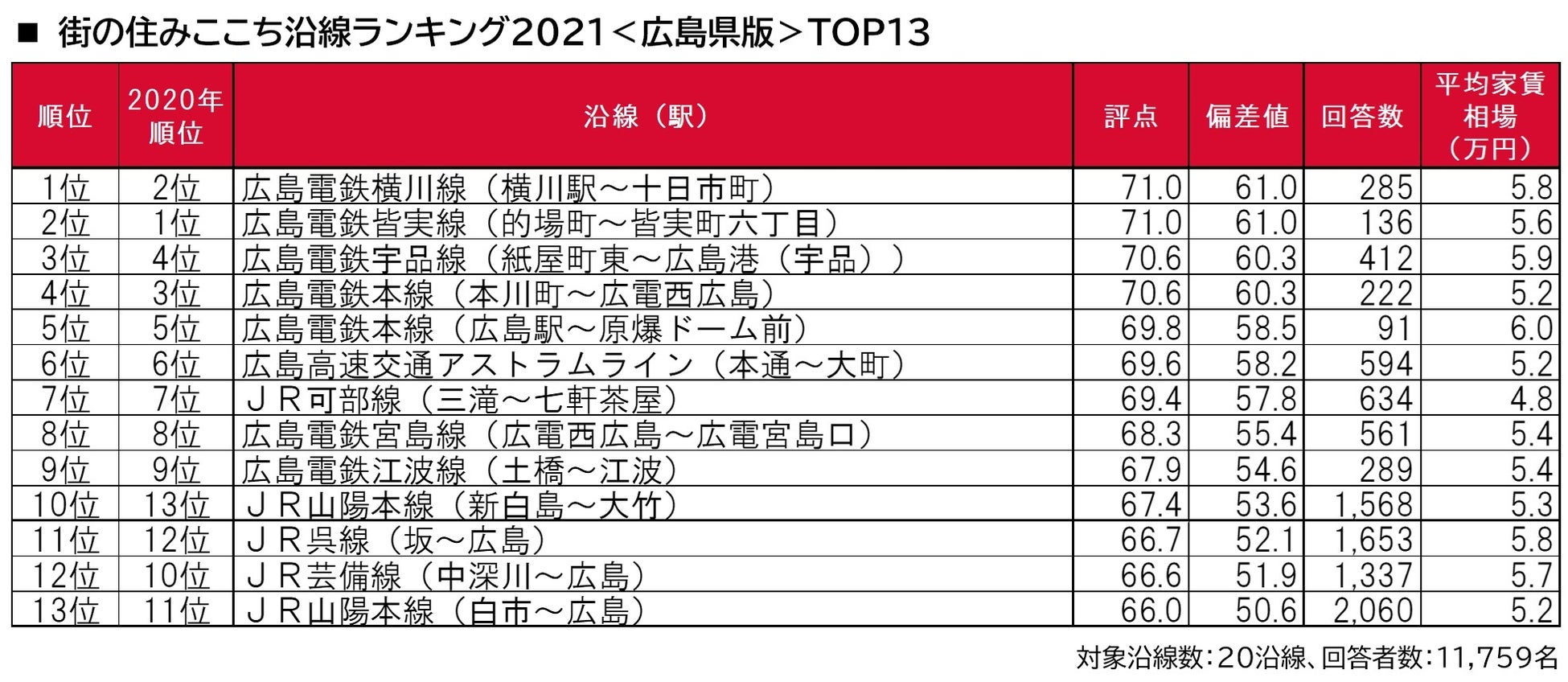 •「街の住みここち沿線ランキング2021<広島県版>」は、広島県の居住者を対象に、2019年~2021年の3カ年分の回答を累積し、回答者数50名以上の沿線をランキング対象として集計しています。なお、偏差値50未満の沿線はランキングに表示していません。