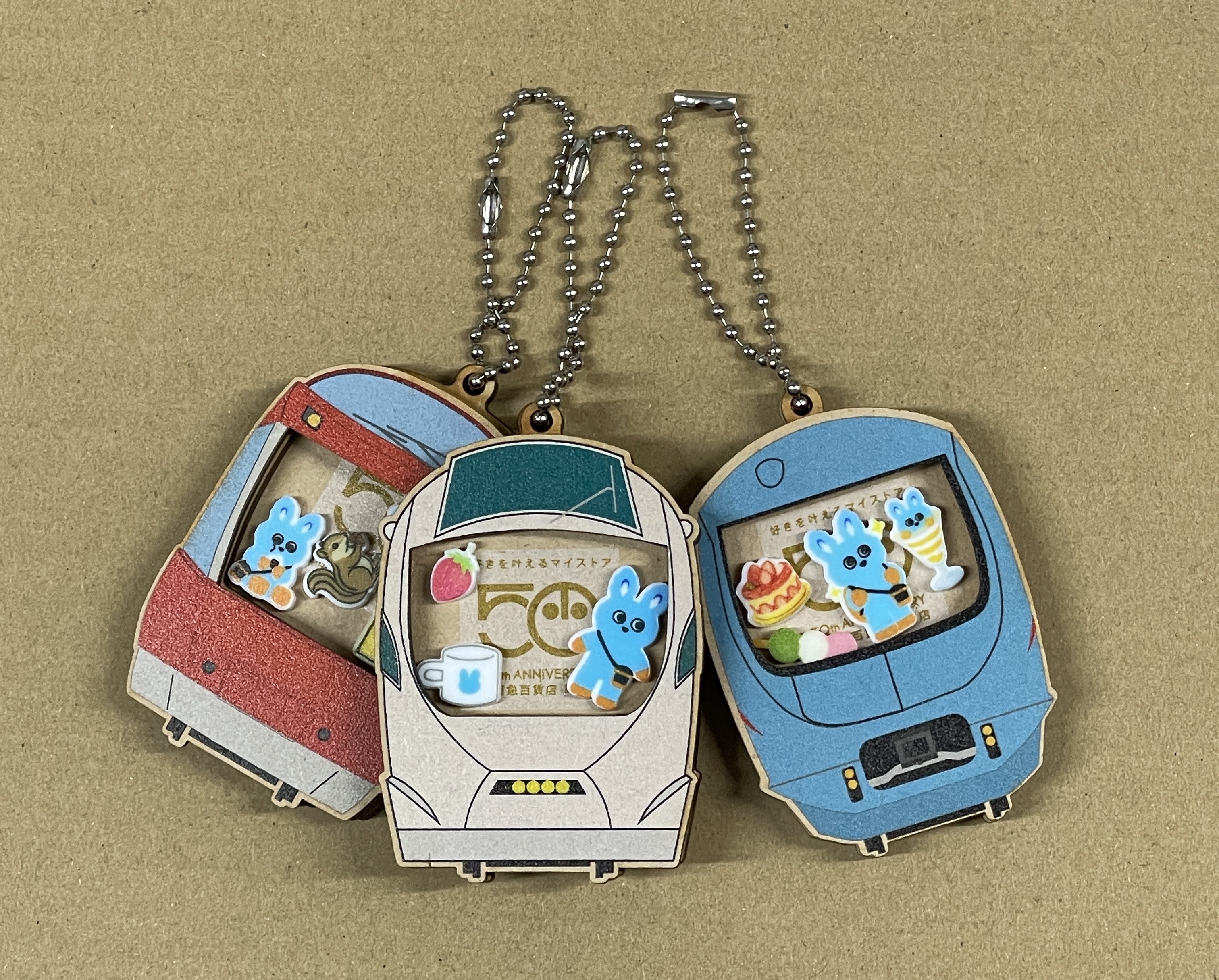 好きな車両とフレークを選んで、自分だけのシャカシャカオリジナルキーホルダーを作ります。車両の背景には町田店開店50周年のロゴデザイン。