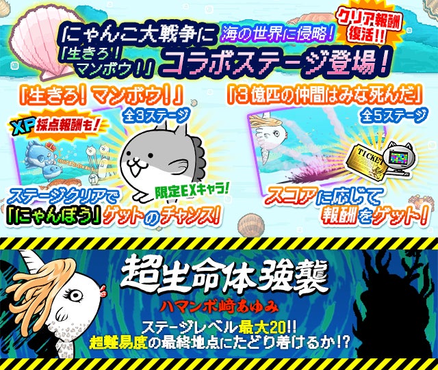 コラボ限定キャラクター「にゃんぼう」が手に入る「生きろ!マンボウ!」、スコアに応じて報酬が手に入る「3億匹の仲間はみな死んだ」、クリアするほど敵が強くなる「ハマンボ崎あゆみ 強襲!」が登場!