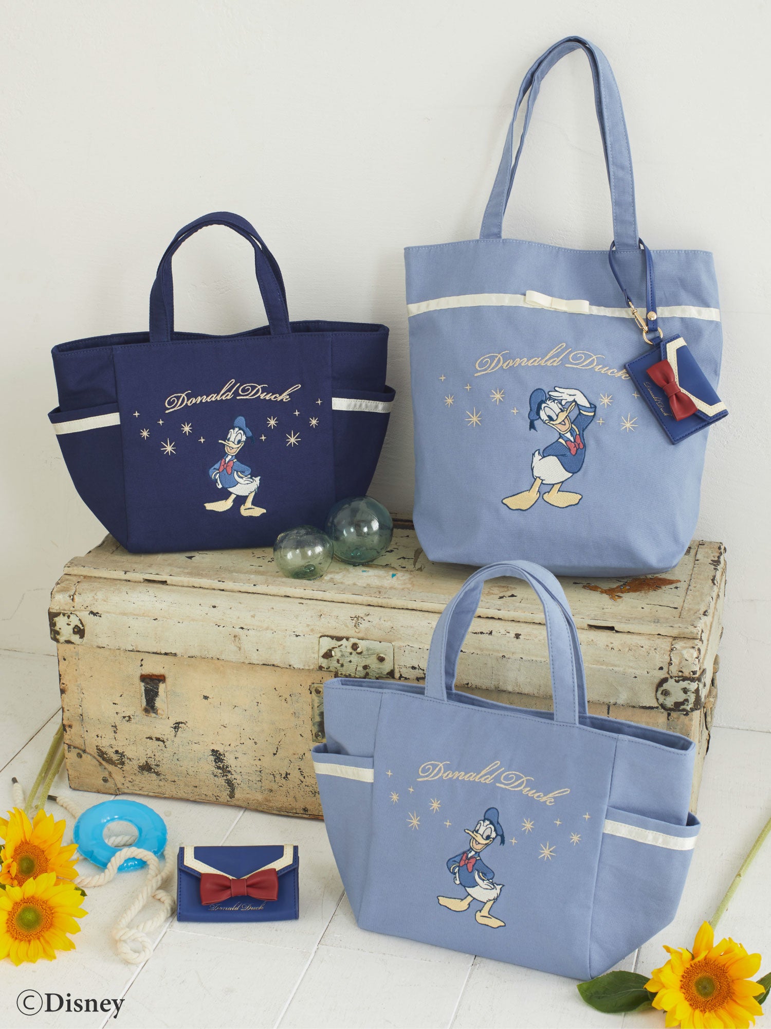 中でも一押しは、ドナルドダックのセーラー服からインスプレーションを得た、サイドポケットトートバッグです。ポケット部分に施したアイボリーのテープは、セーラーカラーのラインを表現。愛くるしい表情とポーズのキャラクターを、淡く落ち着いたカラーで刺繍し、コーディネートを選ばずにお持ちいただける、シンプルで大人っぽい雰囲気に仕上げました。