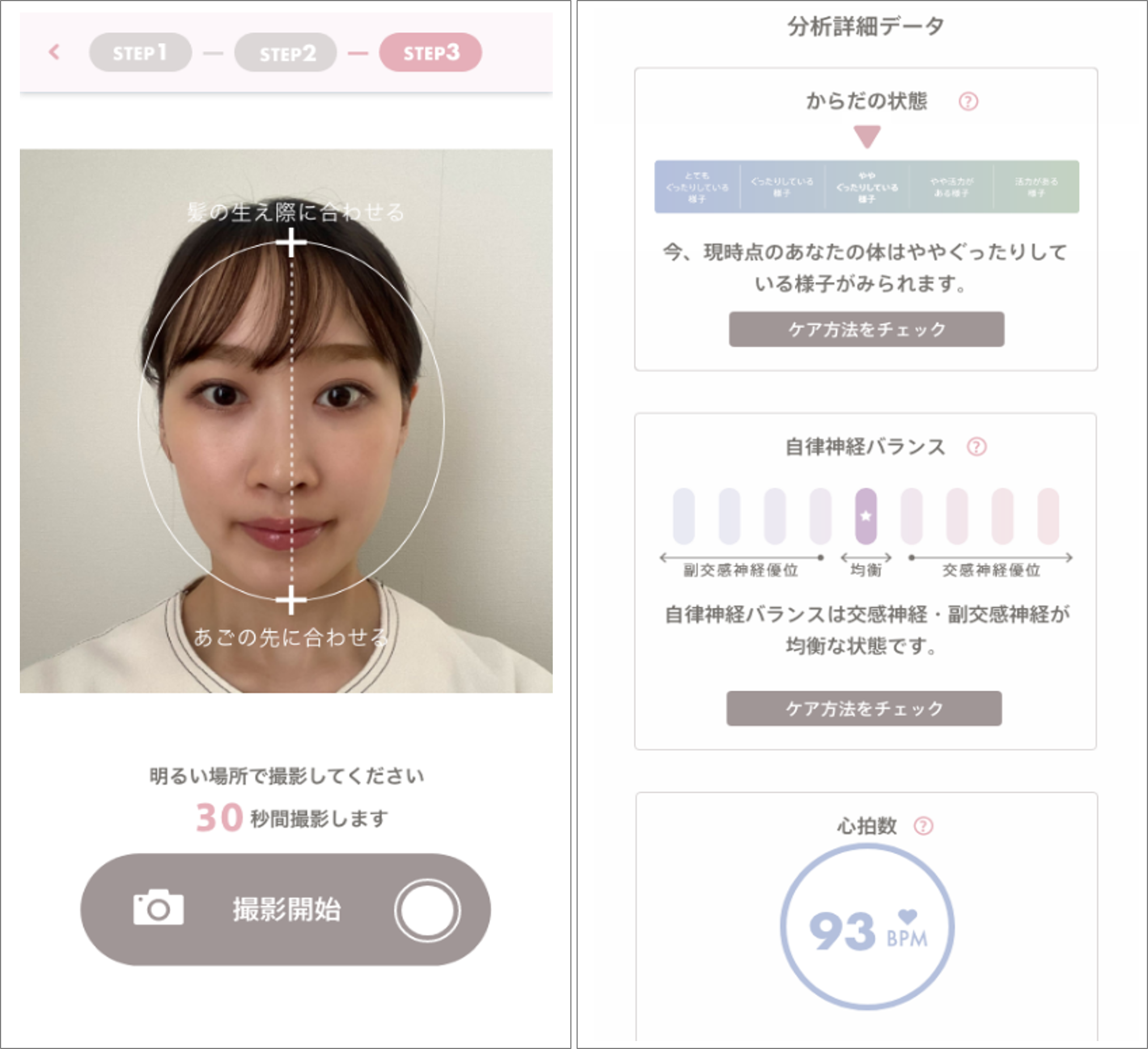 顔の写真を撮ることで、体の疲労傾向度や、心の状態(自律神経バランス)、また心拍数レベルを分析。