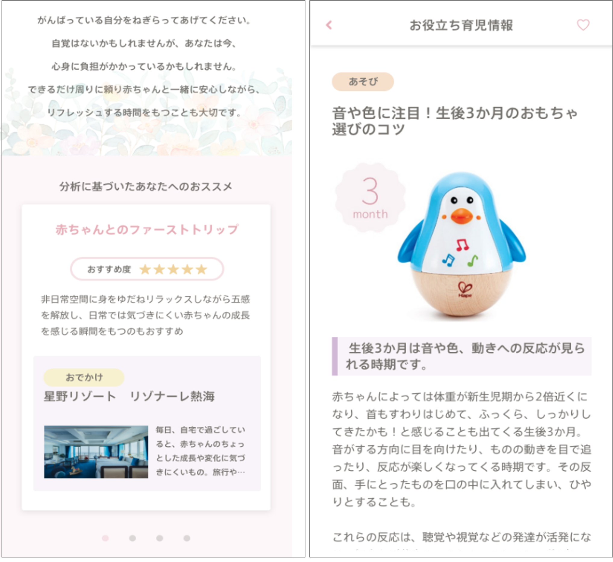産後特有の悩みを解決するケア方法や、乳幼児ファミリーを手助けするサービス、赤ちゃんとの生活がもっと楽しくなる情報、月齢に合わせた育児情報などが提案されます。