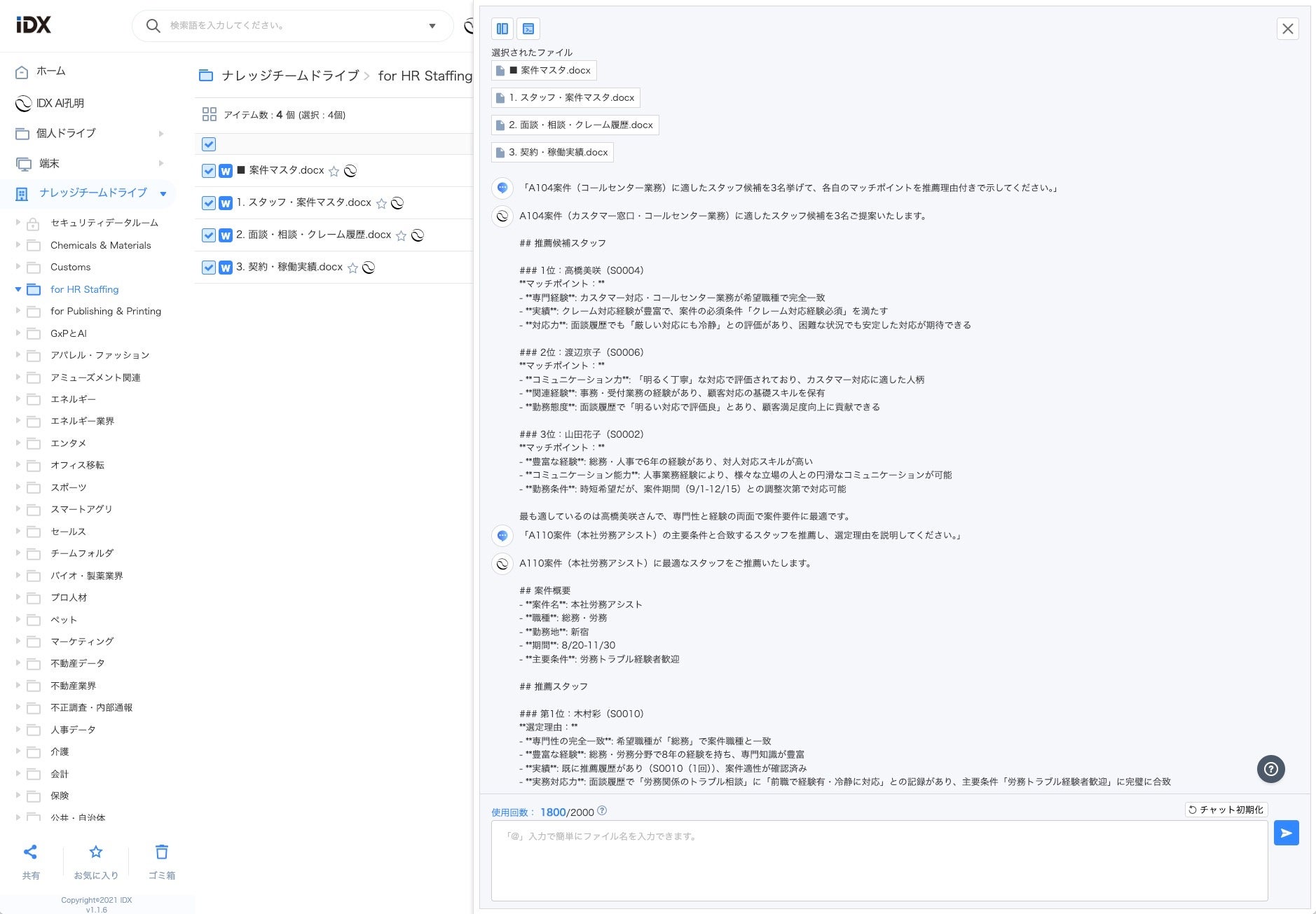 → 面談メモ・クレーム対応記録・採用要件などの非構造データをナレッジDB化し、横断検索、該当履歴の要点を要約。類似事例の引き出しや業務の引き継ぎに活用。