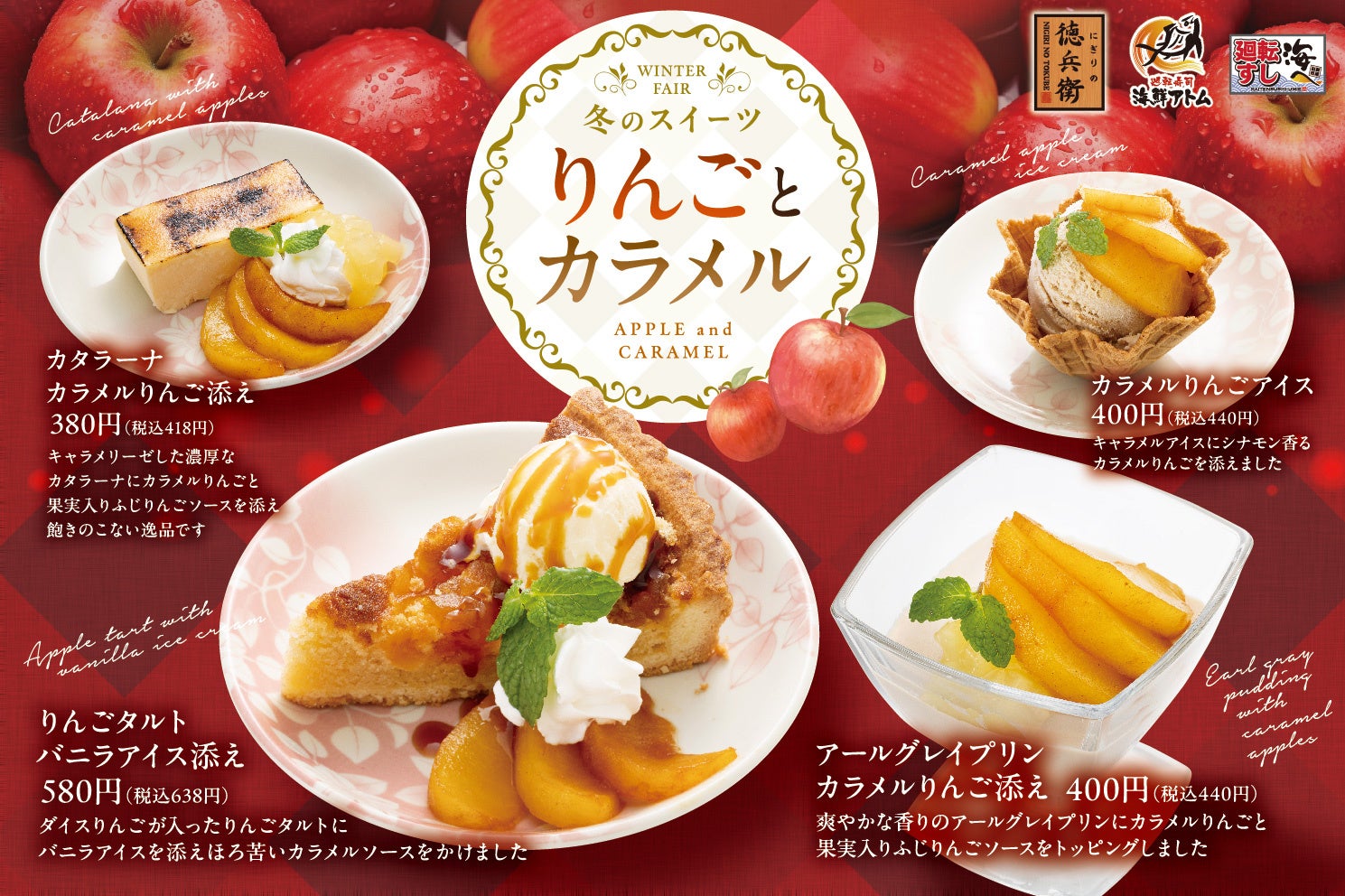 グルメ廻転寿司 にぎりの徳兵衛、海鮮アトムなど50店舗冬の新作スイーツ「りんごとカラメル」1月14日(火)より販売開始!