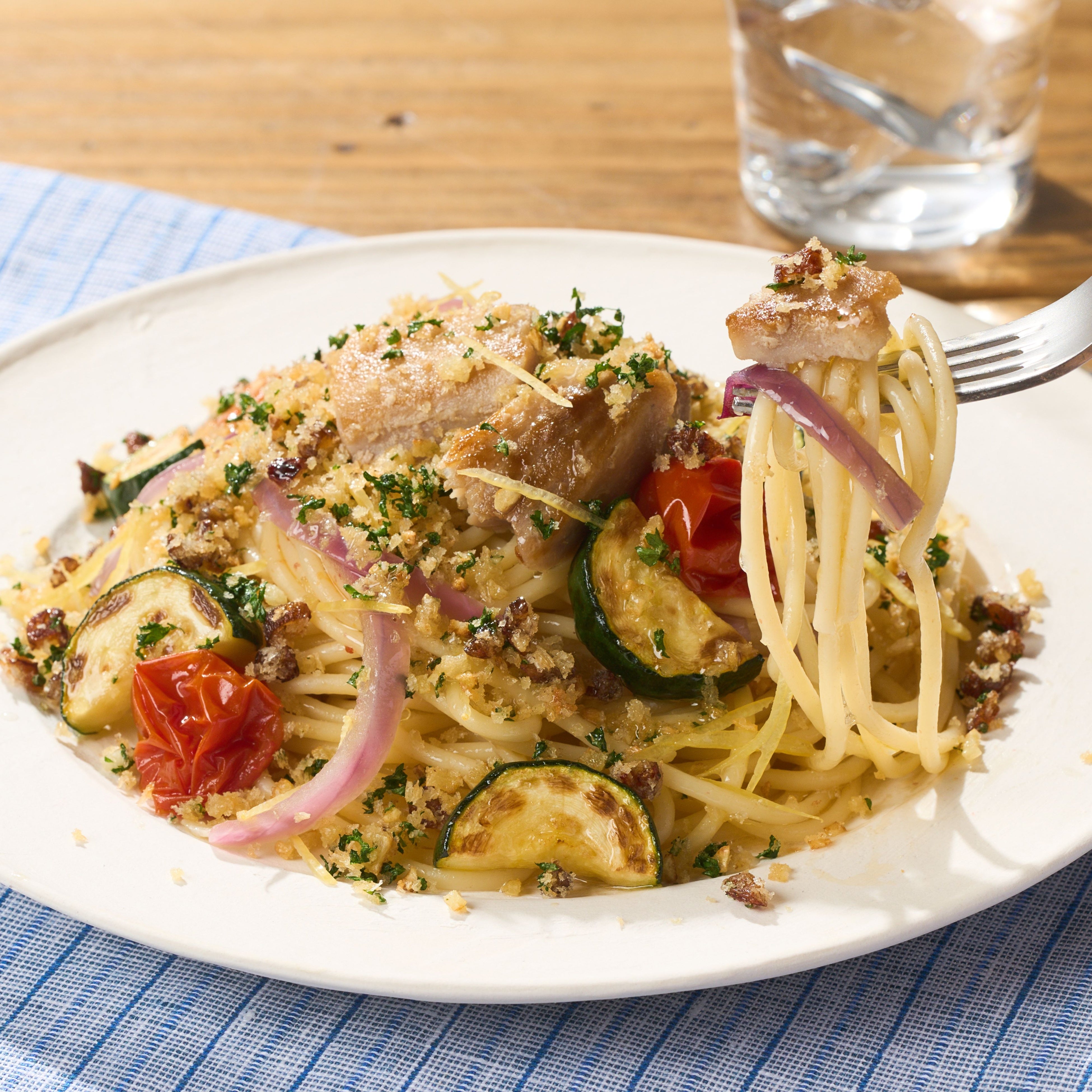 スシローでご提供している「厳選めばち鮪」などの「わかれ身」を、「Oisix」が柔らかな「コンフィ」に仕立て、彩りある旬野菜と合わせて、シチリア風パスタのミールキットに仕上げました。にんにく・パセリ・レーズンの味が楽しいサクサクパン粉が味の決め手です。コンフィのエキスを旬野菜とパスタにたっぷり吸わせたうま味が溢れる一皿をお楽しみいただけます。