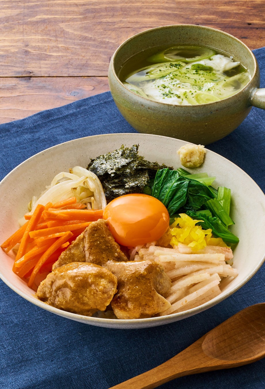 スシローでご提供している「厳選めばち鮪」などの「わかれ身」を柔らかく火入れし、特製のごま味噌だれと卵黄、たっぷりの野菜と合わせて食べる、さっぱりとした和風ビビンバです。味の決め手はお酢を効かせた特製のごま味噌だれ。好相性の西洋わさびと合わせれば、さらに食欲をかきたてます。ビビンバで余った卵の卵白はあおさが香る副菜のスープに活用。海と畑の恵みをとことん余すことなく味わえる食卓が完成します。
