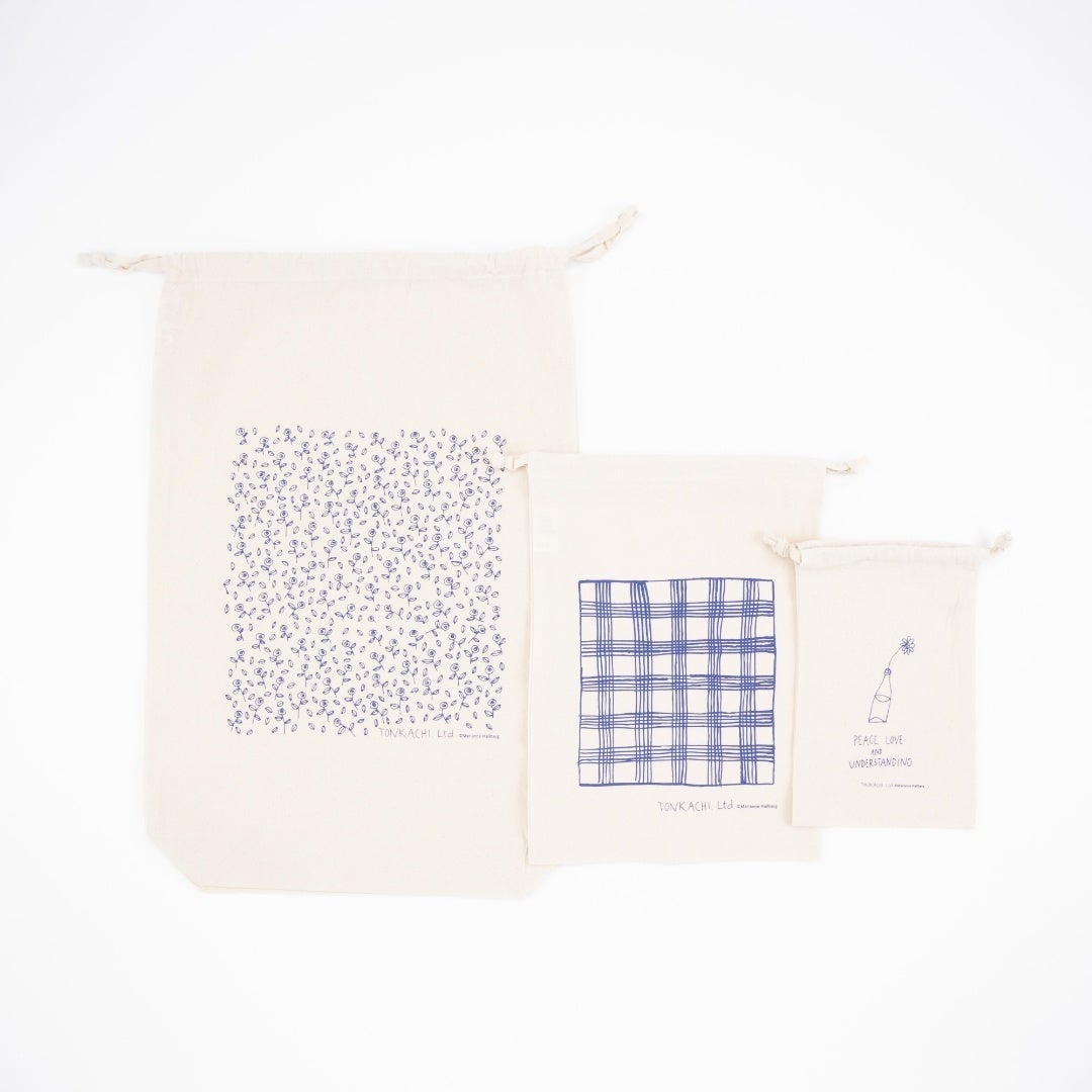 ご注文いただいた商品を、オリジナル巾着袋(2種)にお包みしてお届けします。商品サイズに合わせて梱包いたしますので、そのままギフトとしてお渡しいただけます。