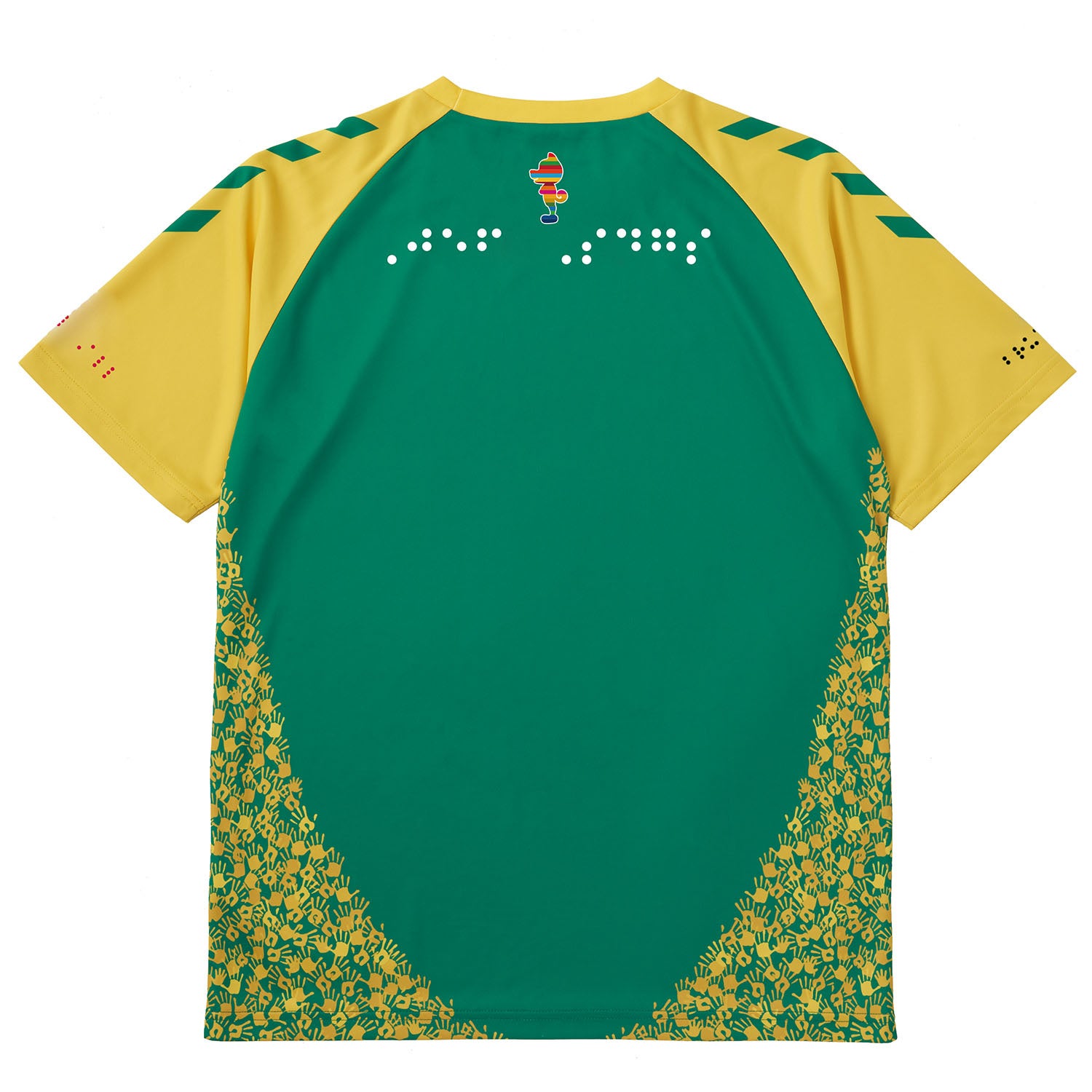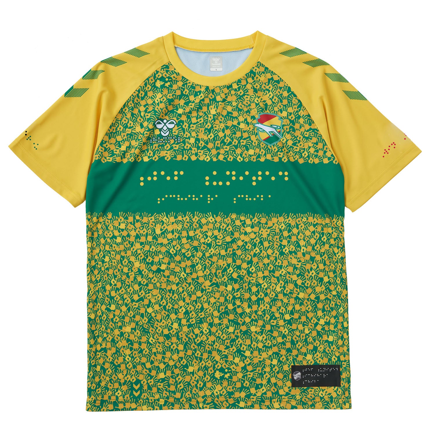 デザインとして点字を活用したシャツは、胸部にクラブ名「jef united ichihara chiba」を、右袖にはホームタウン名「いちはら ちば」を、左袖にはクラブスローガン「WIN BY ALL」、背中にはJEF SDGsをロゴと点字で配置。右胸のヒュンメルロゴも、「hummel」を点字で表した今回だけのロゴに。シャツの裾部には、クラブ名を点字加工で施し、浮き出た文字を指先で触って読み取れるようにしています。