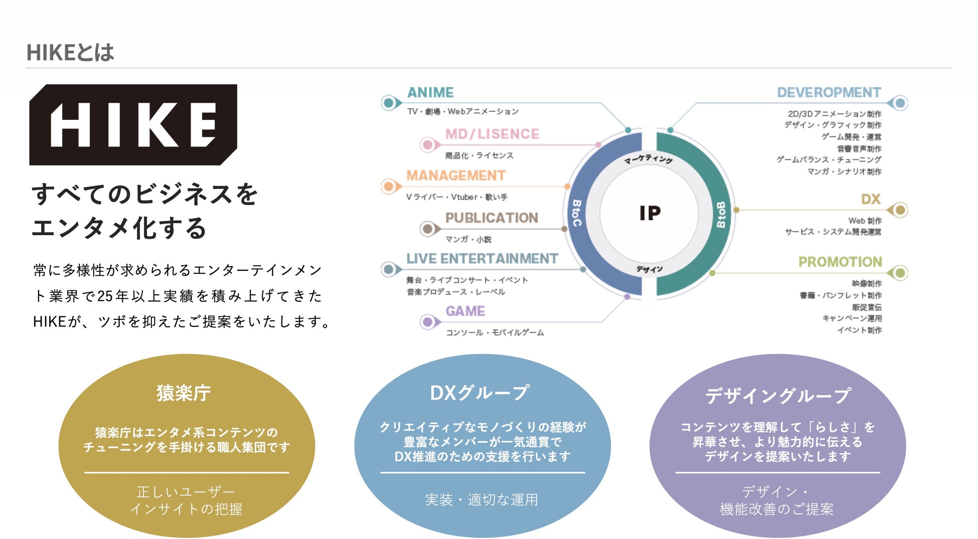 IPプロデュース / ゲームパブリッシング /マーチャンダイジングなどのBtoCビジネスと、グラフィック制作 / コンテンツマーケティング、プロモーション / ゲーム開発サポート/ グローバルHRなどのBtoBビジネスを行うエンターテインメントカンパニー。