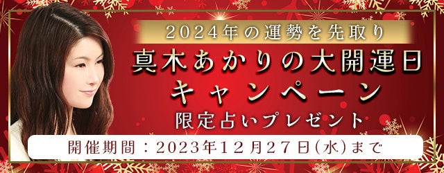 真木あかりの公式占いサイトでは、『2024年の運勢先取り!真木あかりの大開運日キャンペーン』を開催中です。期間中、対象の鑑定を占っていただいた方には、期間限定の占いをプレゼントいたします。