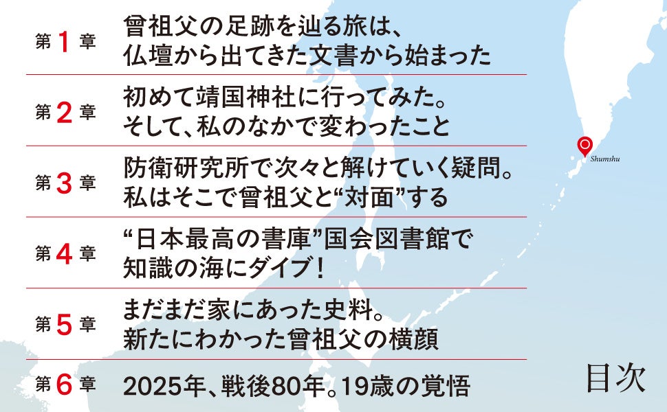 調べていくと、曾祖父は「占守島の戦い」に、停戦交渉軍使のロシア語通訳として随行し、戦死していたことを知るのでした。“終戦”3日後にそんな戦いがあったのか。19歳の情報系高専生が、あらゆる方法で自分のルーツを探すなかでわかった、占守島の戦いのこと、そして戦争、平和、家族愛について、等身大の思いを綴ります。