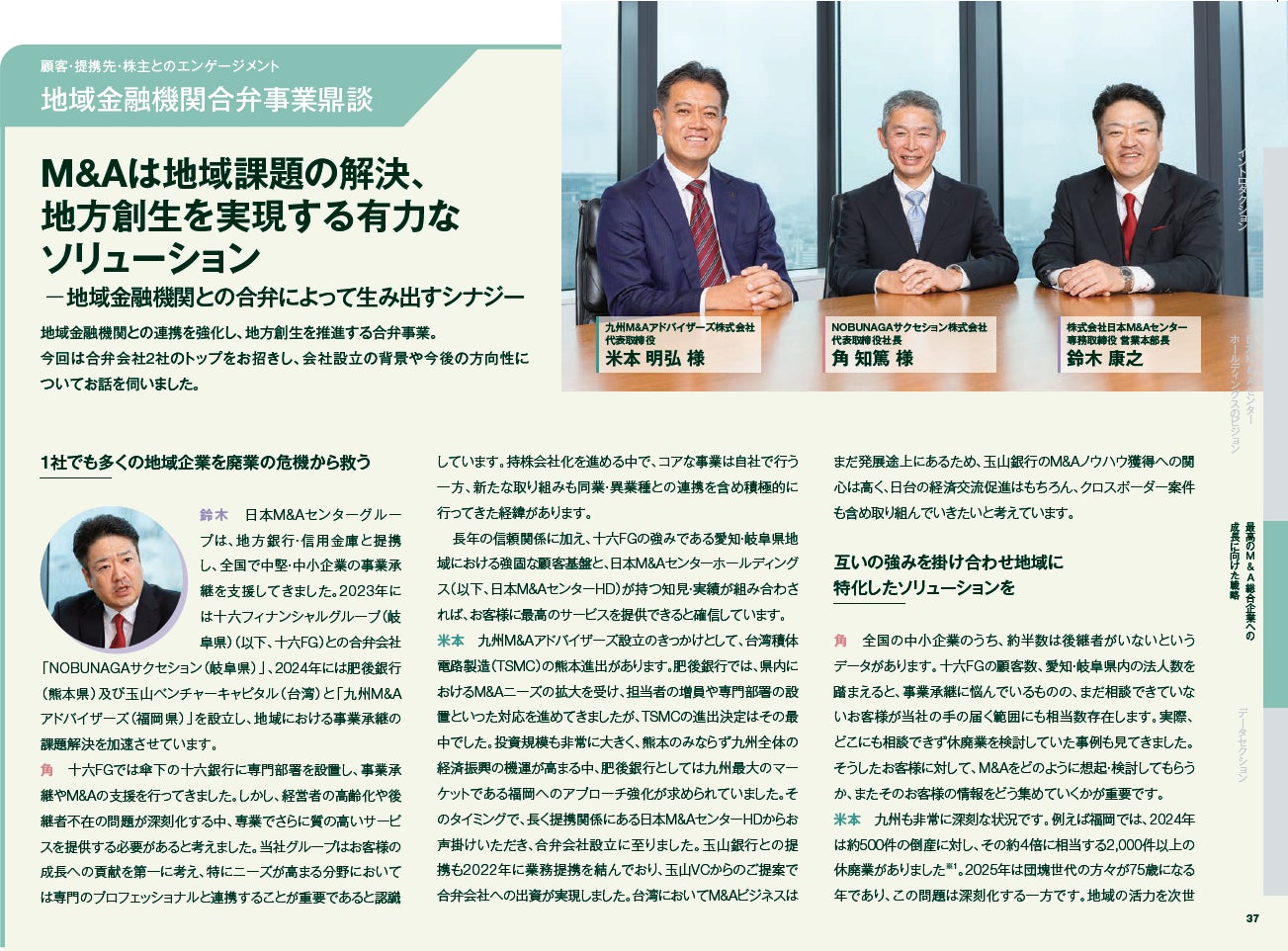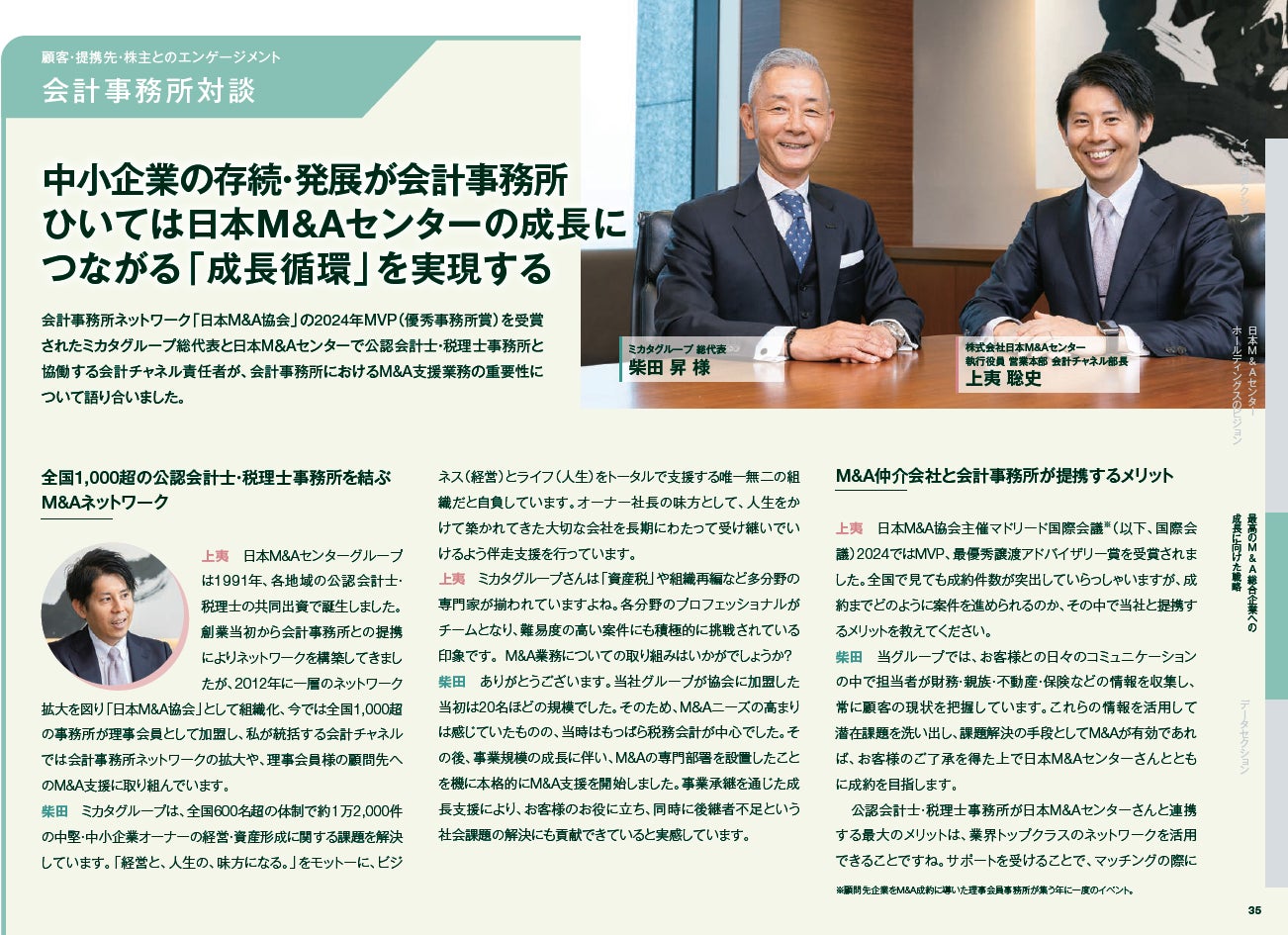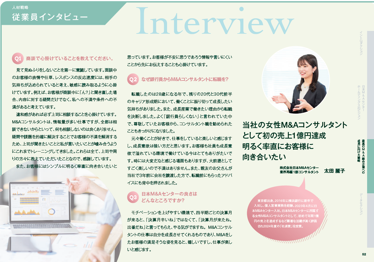 さらに、今年度はステークホルダーの皆様の声を反映し、中核子会社である日本M&Aセンターと提携する会計事務所代表との対談記事や、地域金融機関と設立した合弁会社トップとの鼎談記事、お客様インタビュー、当社をカバレッジする証券会社アナリストとの座談会記事も掲載しています。