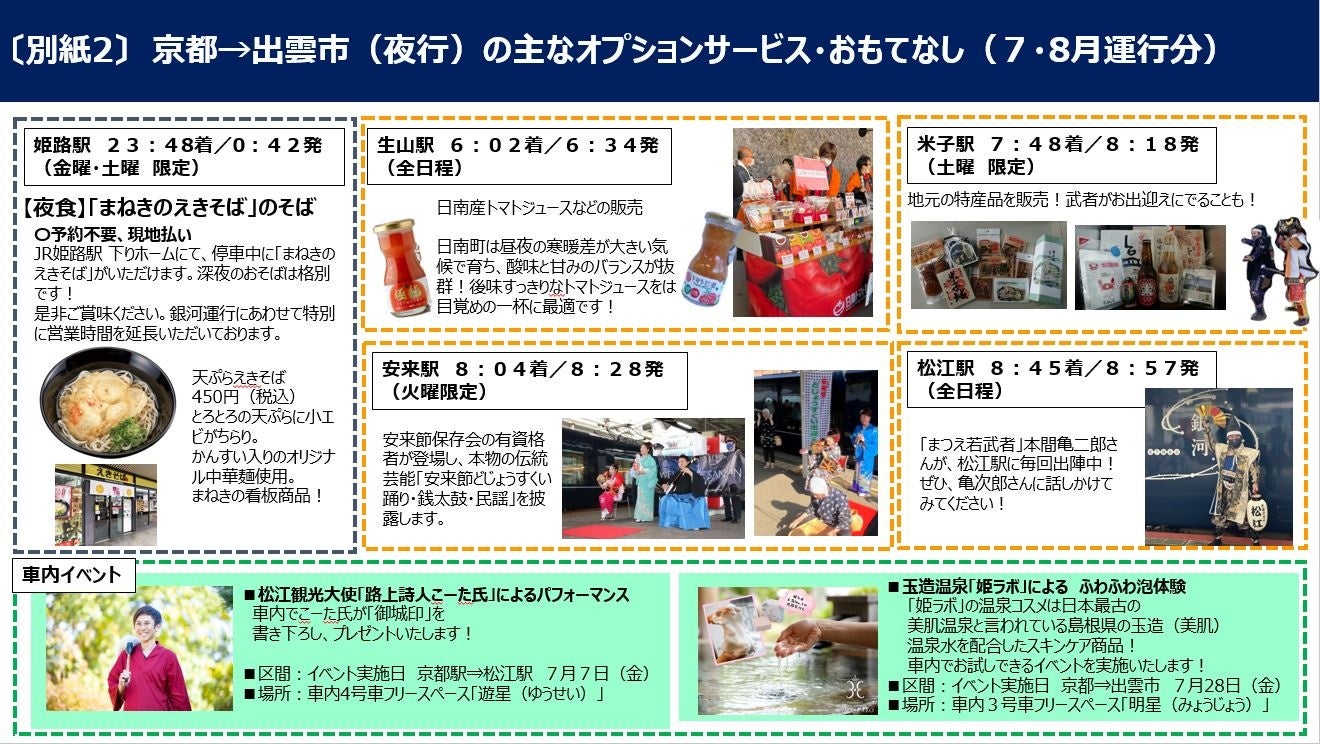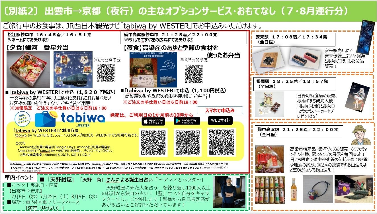 現在、運行している「WEST EXPRESS 銀河(山陰コース)」について、7月3日以降の列車を、JR西日本ネット予約サービス「e5489」等で販売することを決定しましたので、お知らせします。