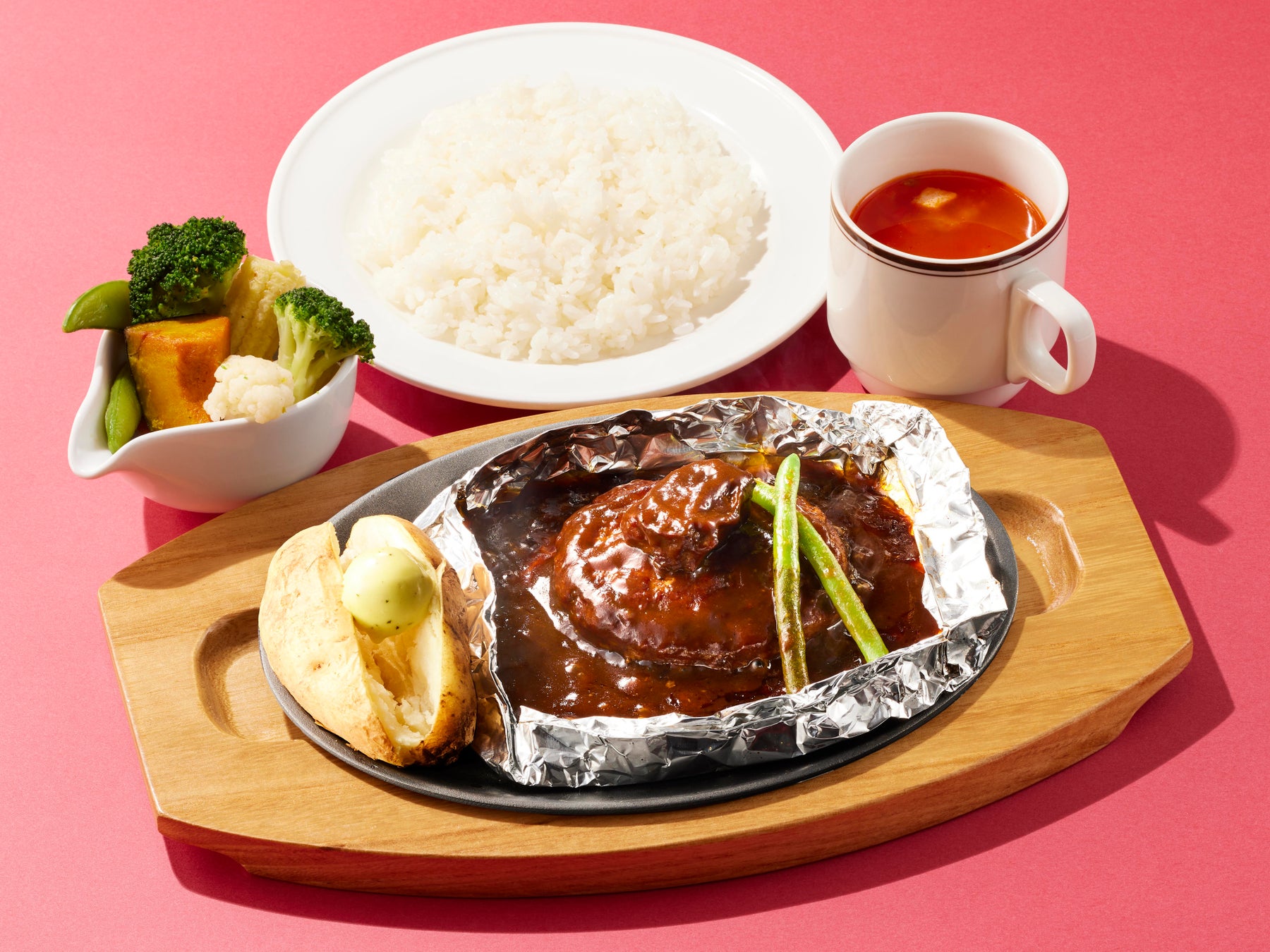 濃厚なチーズソース、ハンバーグと相性の良い目玉焼き、たっぷりの温野菜からお選びください。