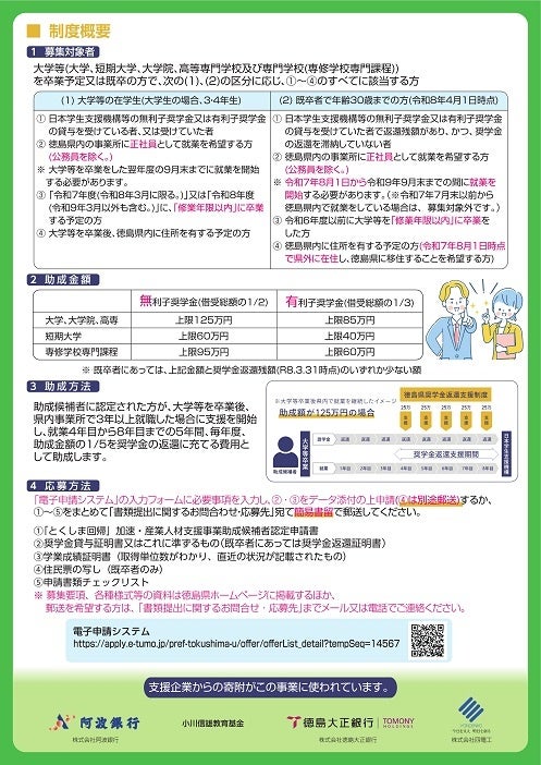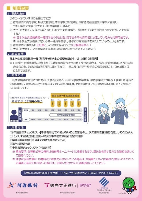 若者の地元定着と地域経済を支える人材の確保を図るため、大学等を卒業後、県内事業所で正社員として一定期間以上就業した場合に奨学金の返還を支援する徳島県奨学金返還支援制度の「助成候補者」を募集します。