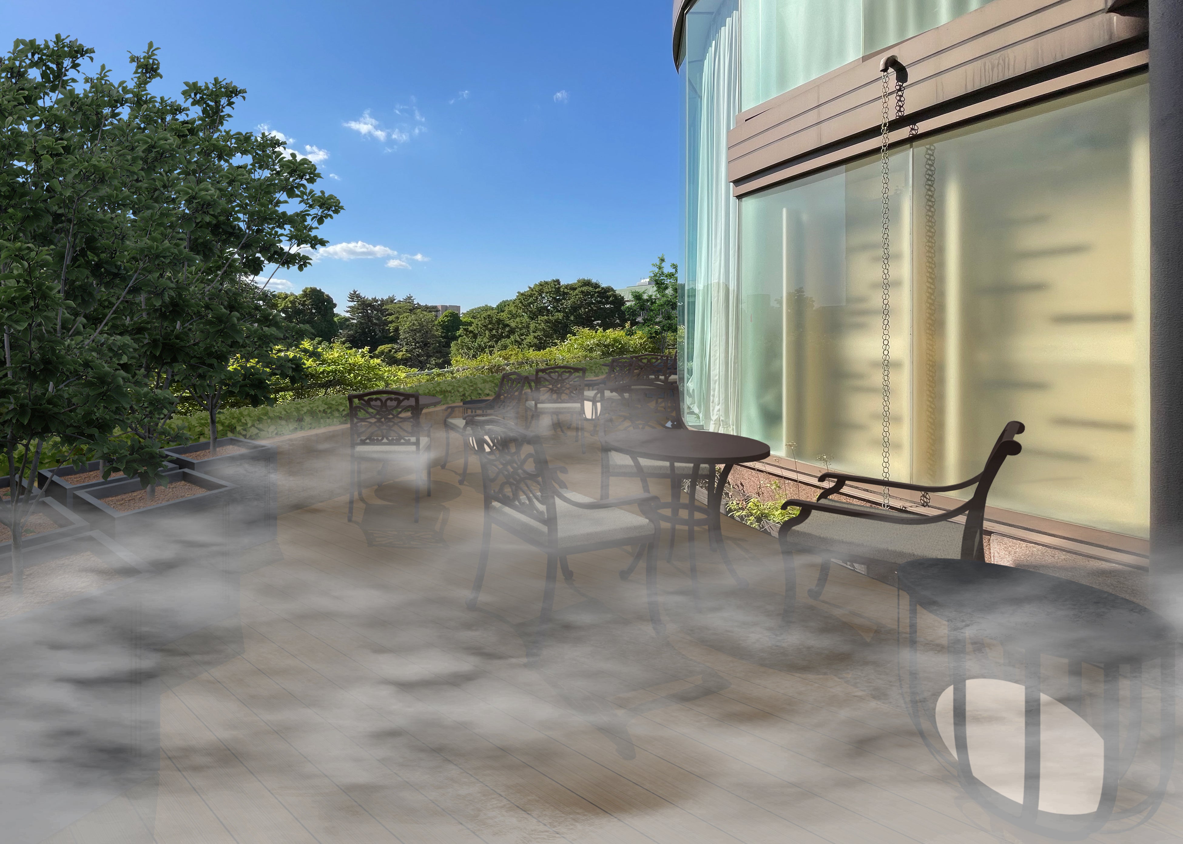 また、テラス全体に、庭園演出「東京雲海」と同じ霧のミストが出現。庭園に抱かれた開放的なテラ ス席は、大地に近く、都心にいることを忘れさせるかのような景観に恵まれ、さながら森のような情景 と空をご堪能いただけます。