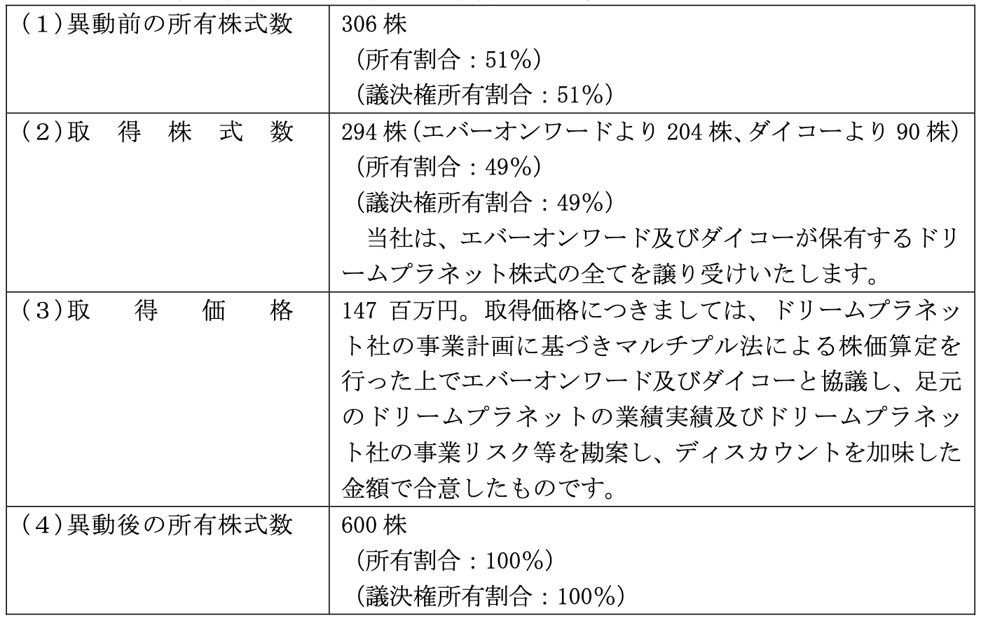 株式取得(子会社化)に関するお知らせ」のとおり、当社はドリームプラネットの株式の51%を取