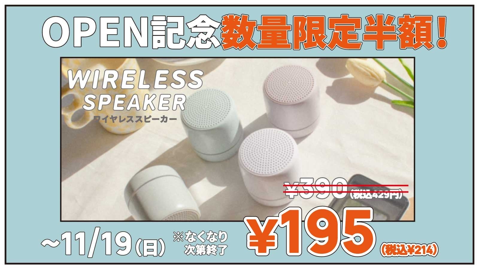 オープンから10日間は、累計販売数14万個以上を売り上げている人気の「ワイヤレススピーカー」を数量限定半額の税抜195円(税込215円)で販売いたします。