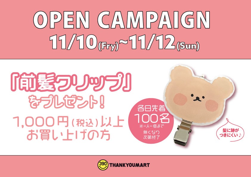 オープンから3日間、税込1,000円以上お買い上げの各日先着100名様に「前髪クリップ」をプレゼント!