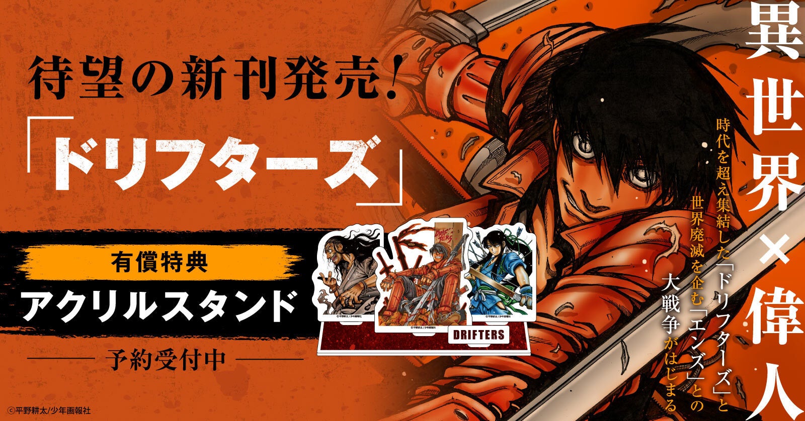 約5年ぶりとなる『ドリフターズ』新刊発売を記念して、当店限定有償アクリルスタンド付きセットが登場!