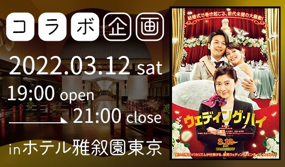 株式会社IBJ(代表取締役社長:石坂 茂、東証一部:6071)が運営する婚活パーティーサービスのPARTY☆PARTYは、2022年3月12日(土)公開の篠原涼子さん主演映画『ウェディング・ハイ』とコラボした婚活パーティーを、ホテル雅叙園東京にて開催します。『恋するあなたにブーケトス♡出会える結婚披露宴!?』と題し、友人の披露宴に参列する感覚でお楽しみいただける、エンターテイメント婚活パーティーです。