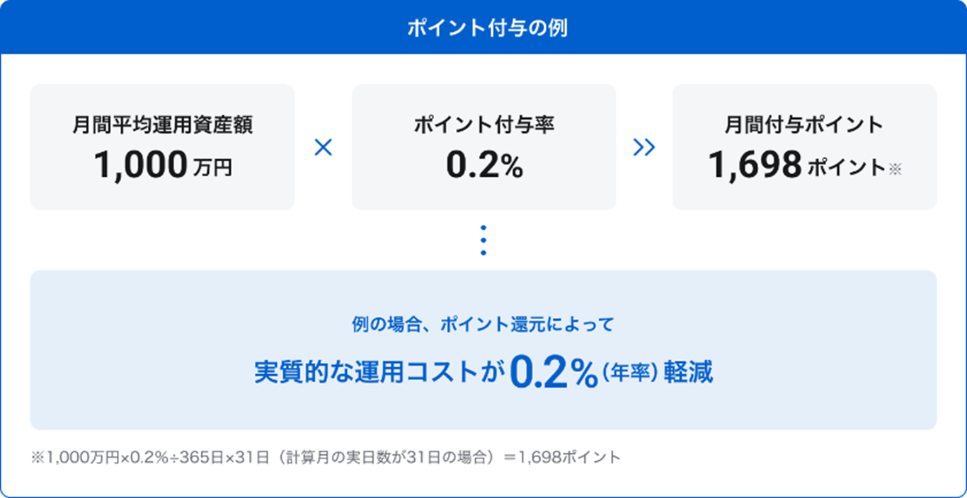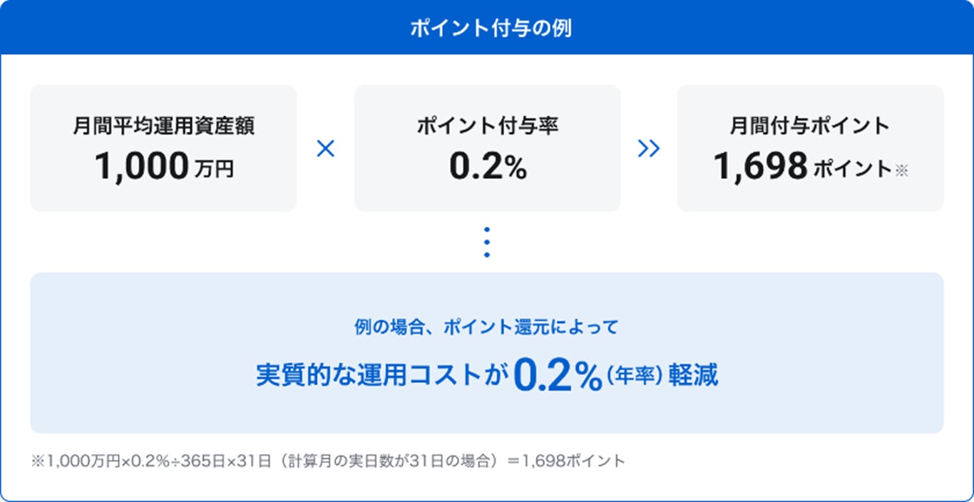 2022年4月の運用分から、「SBIラップ」の運用資産残高に応じてポイントが貯まる「SBIラップマイレージ」を提供しています。投資信託の保有残高に応じてポイントが貯まる「投信マイレージサービス」と同水準のポイント付与率で、Tポイント、Pontaポイント、dポイントから、お客さまがメインポイントに設定したポイントが貯まります。
