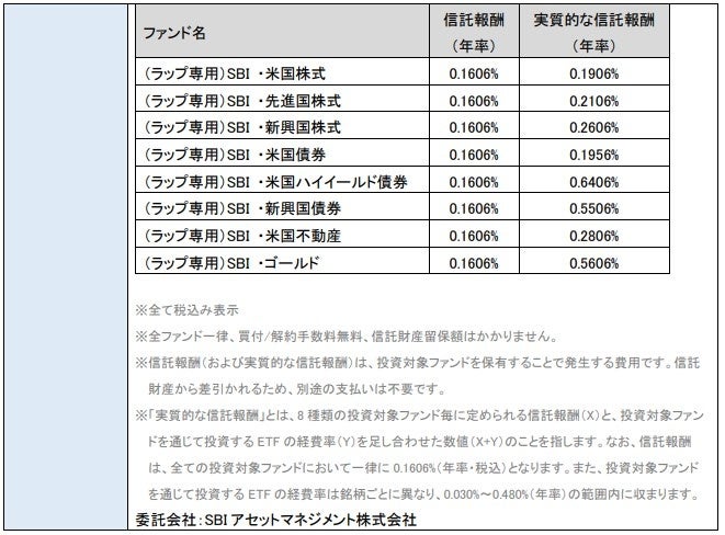 ※「実質的な信託報酬」とは、8種類の投資対象ファンド毎に定められる信託報酬(X)と、投資対象ファンドを通じて投資するETFの経費率(Y)を足し合わせた数値(X+Y)のことを指します。なお、信託報酬は、全ての投資対象ファンドにおいて一律に0.1606%(年率・税込)となります。また、投資対象ファンドを通じて投資するETFの経費率は銘柄毎に異なり、0.030%~0.480%(年率)の範囲に収まります。「実質的な信託報酬の合計額」については、8種類の投資対象ファンドの組み入れ状況によって異なりますが、最新の運用戦略を用いて運用を行った場合、その合計額は0.220%~0.394%(年率・税込)の範囲内に収まります。「実質的な信託報酬の合計額」の平均値については、2012/1/4~2021/12/30までSBIラップで運用を行ったと仮定したバックテストによって示された平均投資配分比率を基に算出したもので、その値は0.295%(年率・税込、小数点第4位切上げ)となりますが、実際の運用においては、この数値を上回る場合があります。