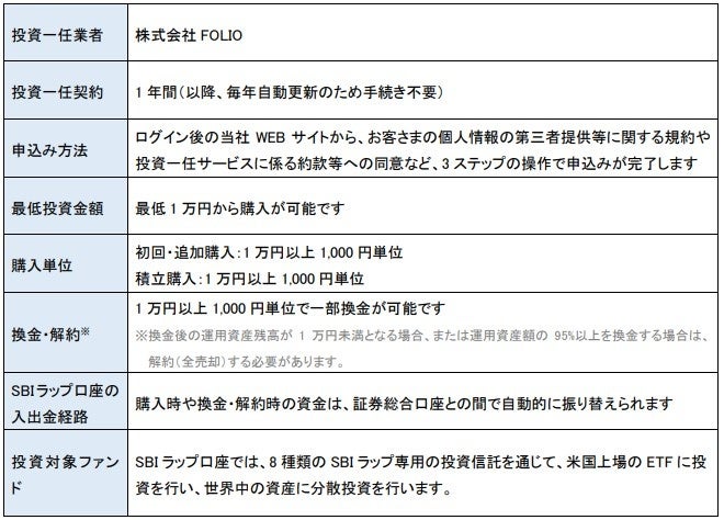 「SBIラップ」は、株式会社FOLIO(本社:東京都千代田区、代表取締役社長:甲斐真一郎、以下「FOLIO」)が提供する、投資一任サービスを提供するためのシステムプラットフォーム「4RAP」を採用し、運用業者が持つノウハウを最大限に活かした質の高い運用サービスを、低コストで提供します。