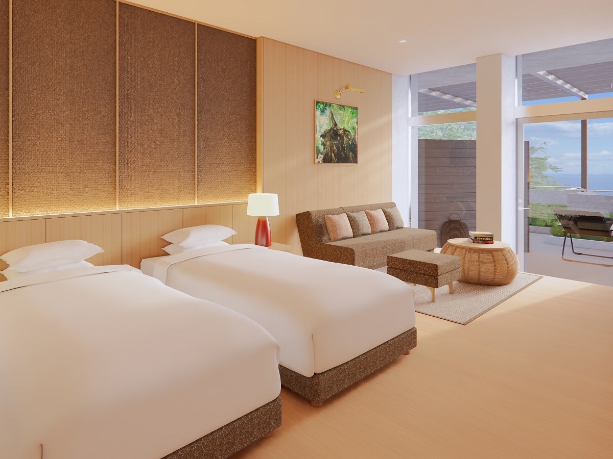 セミダブルサイズの“シモンズベッド”を2台配したオーシャンビューの洋室。14㎡のオーシャンビューテラスには専用のバレルサウナと露天風呂、整い椅子を設置しています。