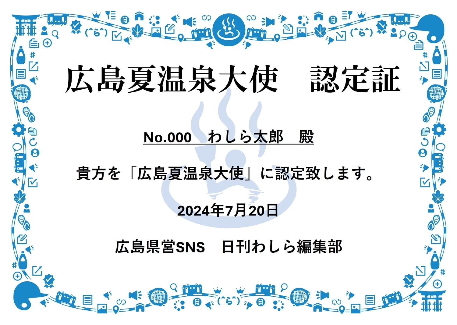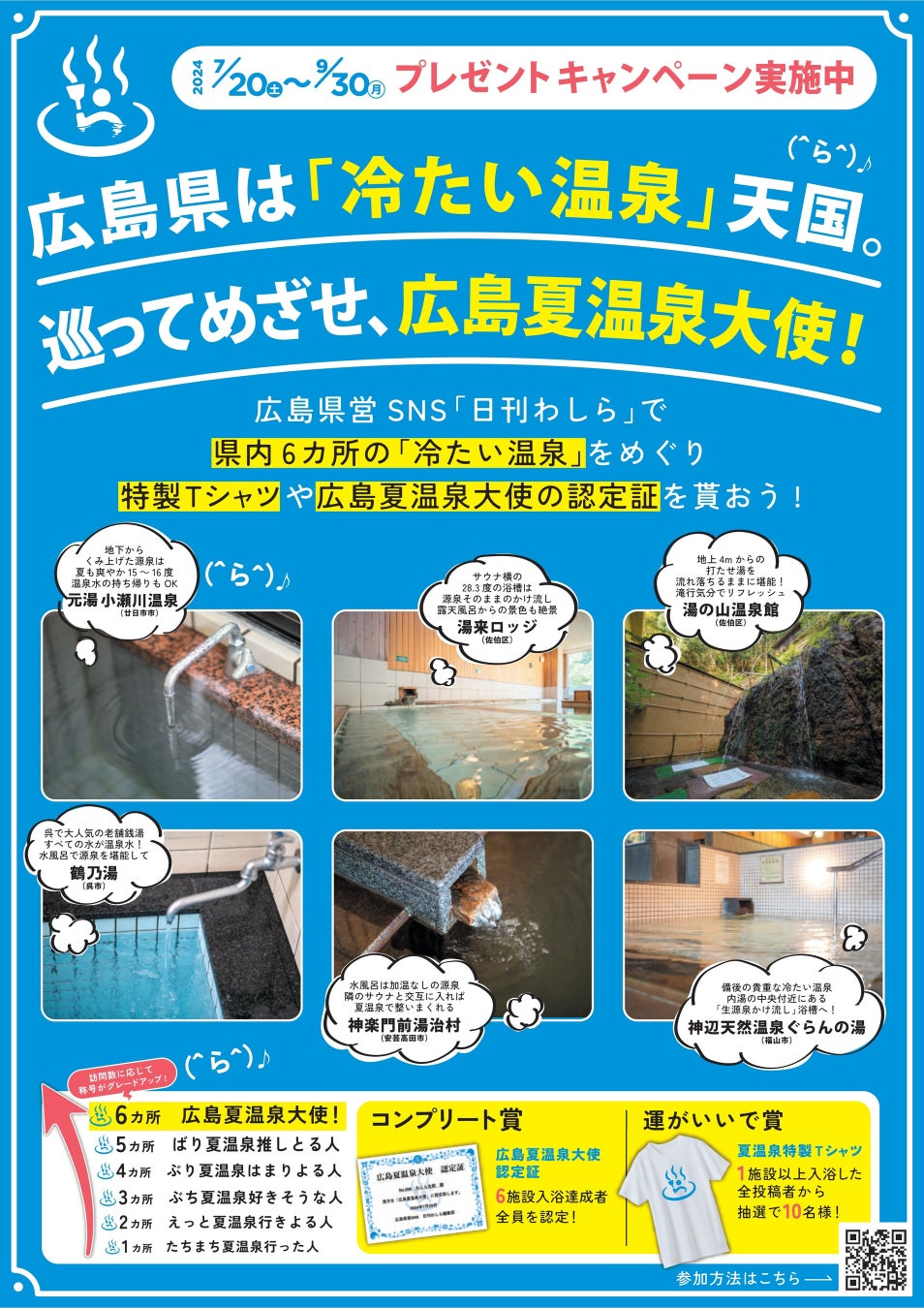 キャンペーン参加者は、広島県内の「源泉かけ流しで入れる低温泉・冷鉱泉」6カ所を巡り、広島県営SNS「日刊わしら」に該当6カ所に関する内容を投稿するだけ。利用施設数に応じて称号が授与され、コンプリートすると「広島夏温泉大使」に認定されます。さらに達成者には認定証が授与されます。
