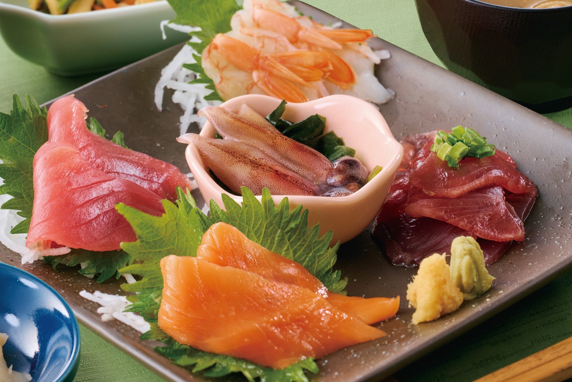 “焼津産・枕崎産かつお”・ “富山県産ほたるいか”のほか、まぐろ・赤海老・サーモンを盛り合わせた贅沢な一皿。
